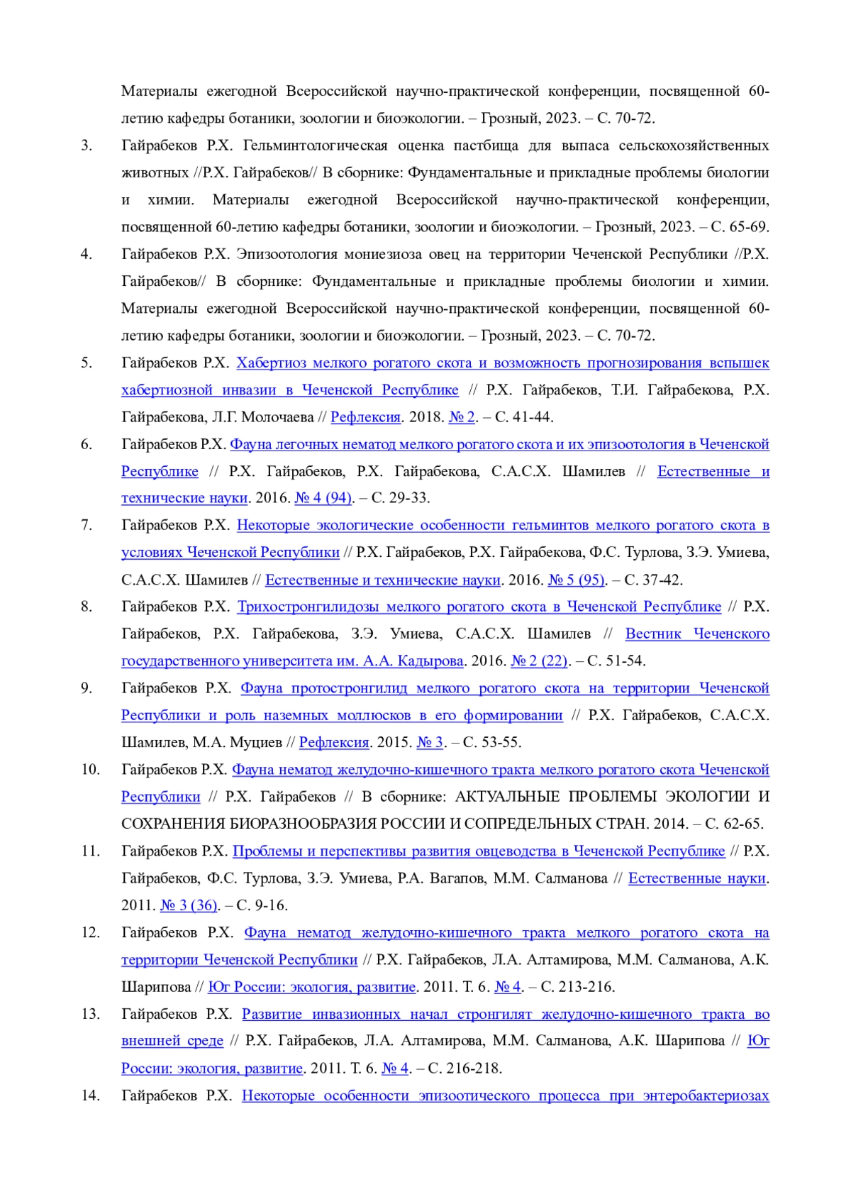 6. Гайрабеков Р.Х. Гельминтологическая оценка пастбища для выпаса сельскохозяйственных животных //Р.Х. Гайрабеков// В сборнике: Фундаментальные и прикладные проблемы биологии и химии. Материалы ежегодной Всероссийской научно-практической конференции, посвященной 60-летию кафедры ботаники, зоологии и биоэкологии. - Грозный, 2023. - С. 65-69. EDN: HQOJXN