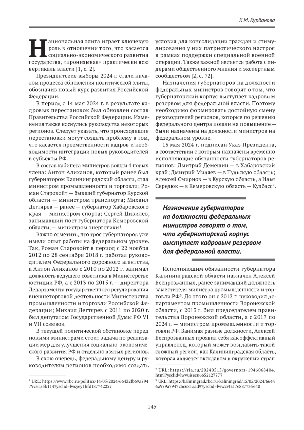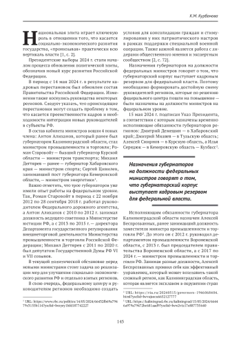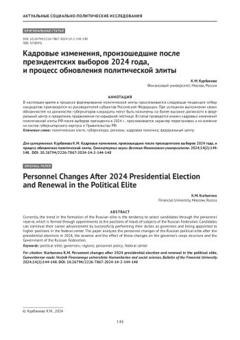 В настоящее время в процессе формирования политической элиты прослеживается следующая тенденция: отбор кандидатов производится из руководителей субъектов Российской Федерации. При успешном выполнении своих обязанностей на должностях губернаторов кандидаты могут быть назначены на более высокие должности в федеральный центр и продолжать продвижение по карьерной лестнице. В статье проводится анализ кадровых изменений политической элиты РФ после выборов президента в 2024 г., прослеживается характер перестановок и их влияние на состав губернаторского корпуса и Правительства РФ.