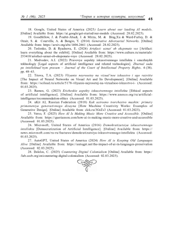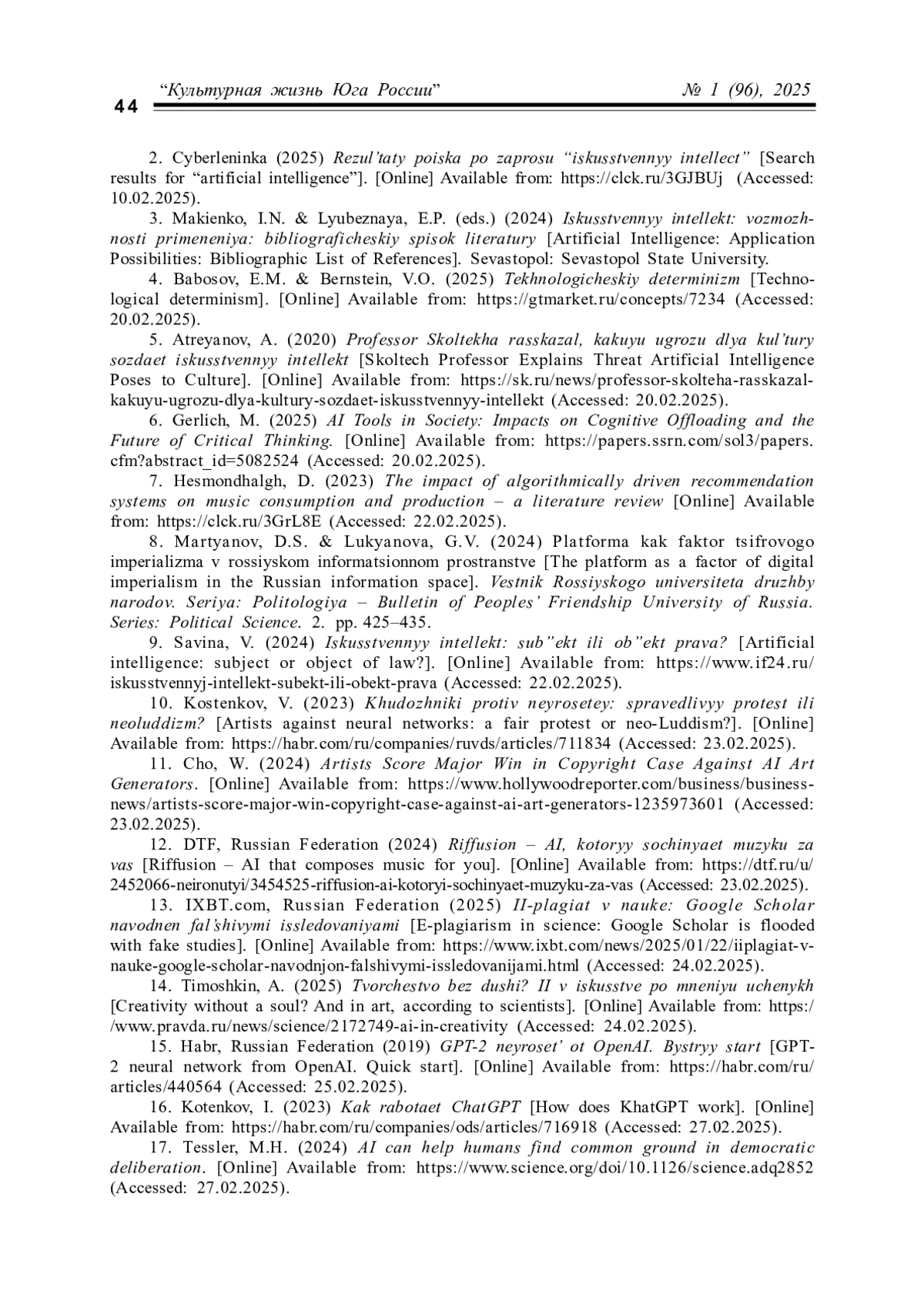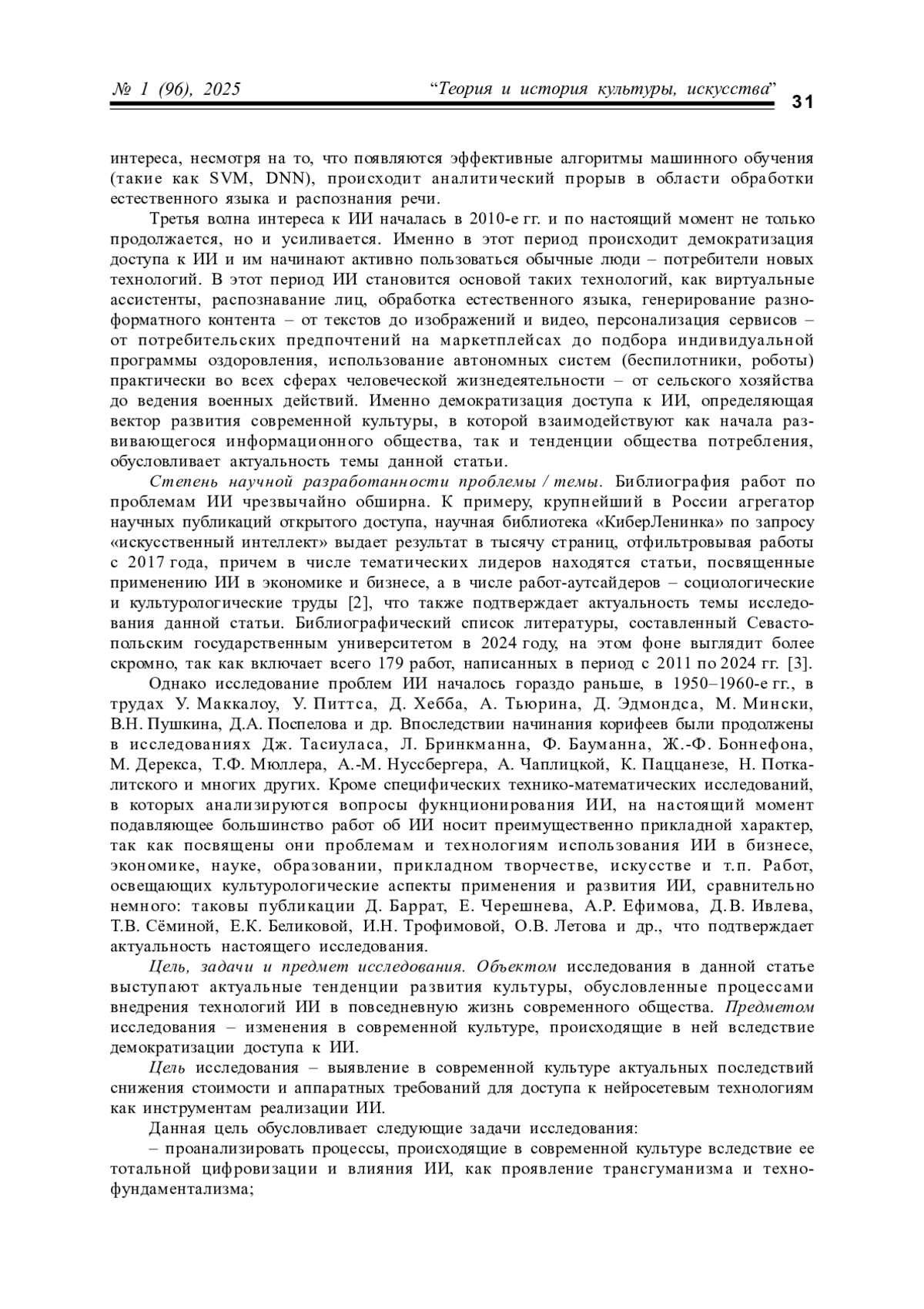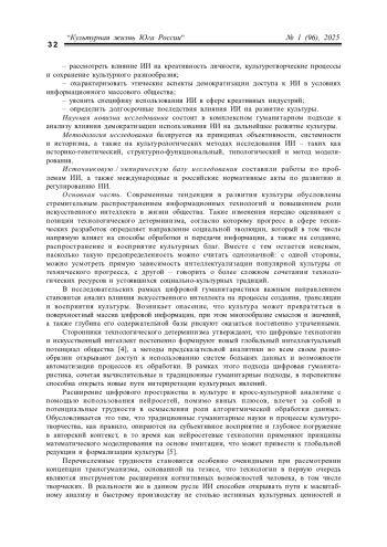 ПАВЛОВА О. А., КУРБАНОВА А. О., ШВЕЦ О. Н. ДЕМОКРАТИЗАЦИЯ ДОСТУПА К ИСКУССТВЕННОМУ ИНТЕЛЛЕКТУ КАК ВЕКТОР РАЗВИТИЯ СОВРЕМЕННОЙ КУЛЬТУРЫ: ПРОБЛЕМЫ, ТЕНДЕНЦИИ И ПЕРСПЕКТИВЫ // КУЛЬТУРНАЯ ЖИЗНЬ ЮГА РОССИИ. 2025. № 1 (96)
