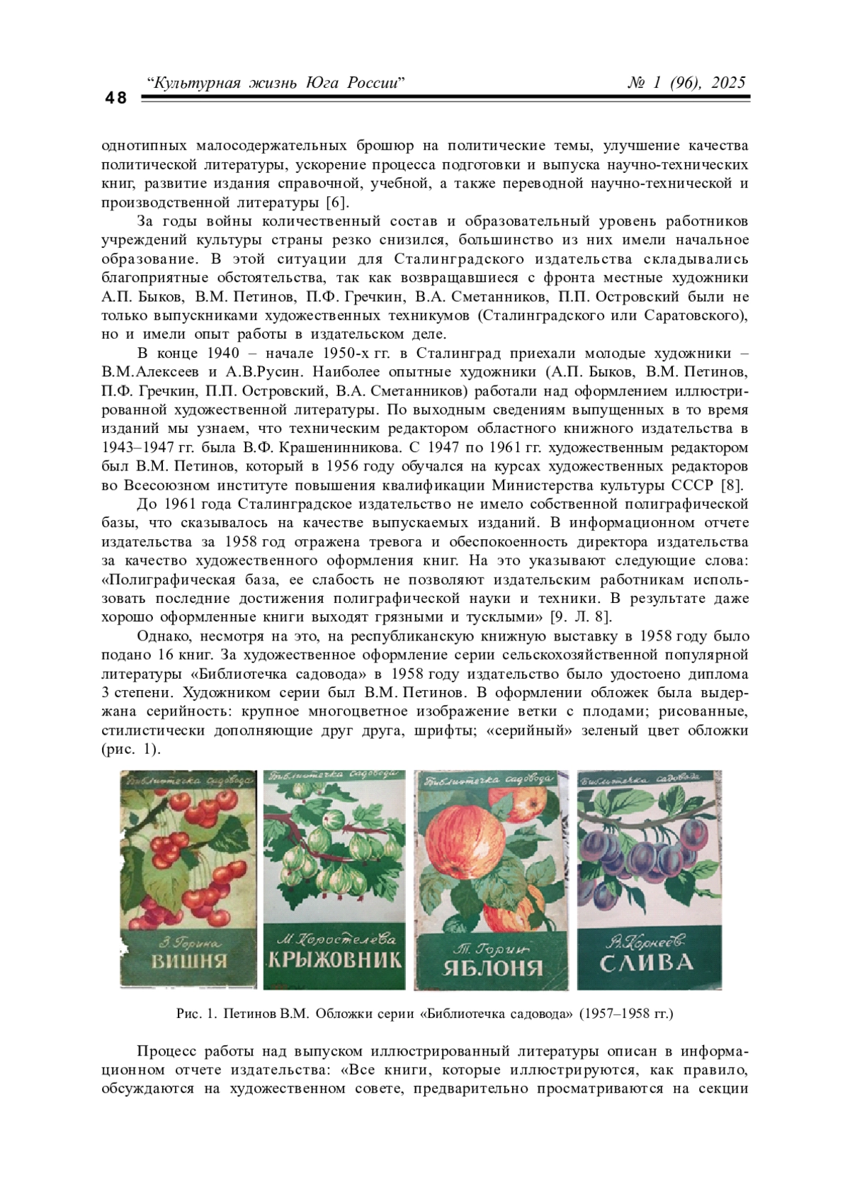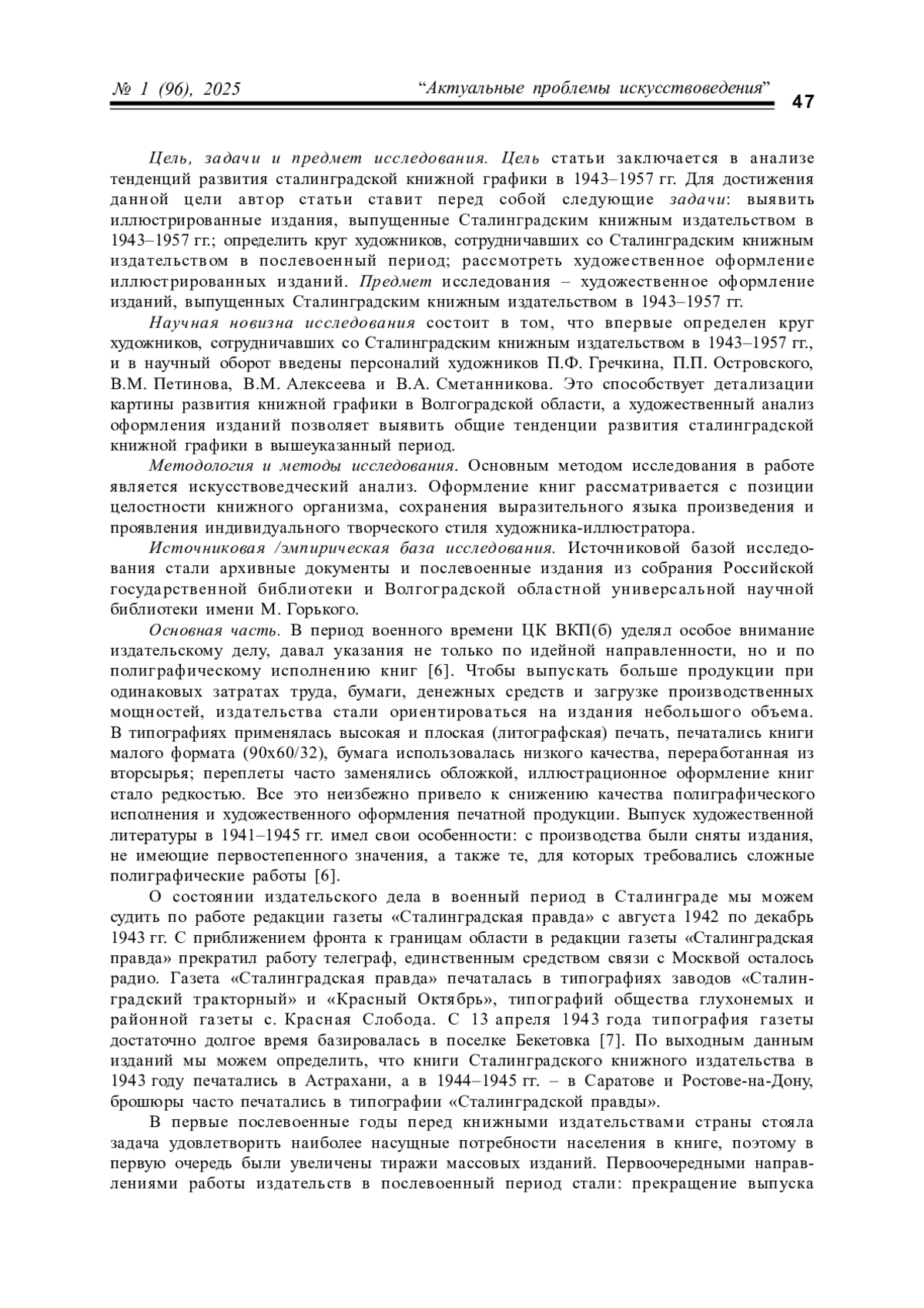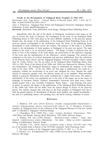 Актуальность темы обусловлена повышенным общественным интересом к изучению регионального искусства книжной графики. Предметом исследования стало художественное оформление книг, выпущенных Сталинградским издательством в послевоенный период. Определен круг художников, сотрудничавших со Сталинградским книжным издательством в 1943–1957 гг. Проведен искусствоведческий анализ изданий, оформленных художниками В. М. Петиновым, В. М. Алексеевым, В. А. Сметанниковым, П. Ф. Гречкиным, П. П. Островским. Художественное оформление изданий рассмотрено с позиций целостности книжного организма и проявления индивидуального творческого стиля художника-иллюстратора