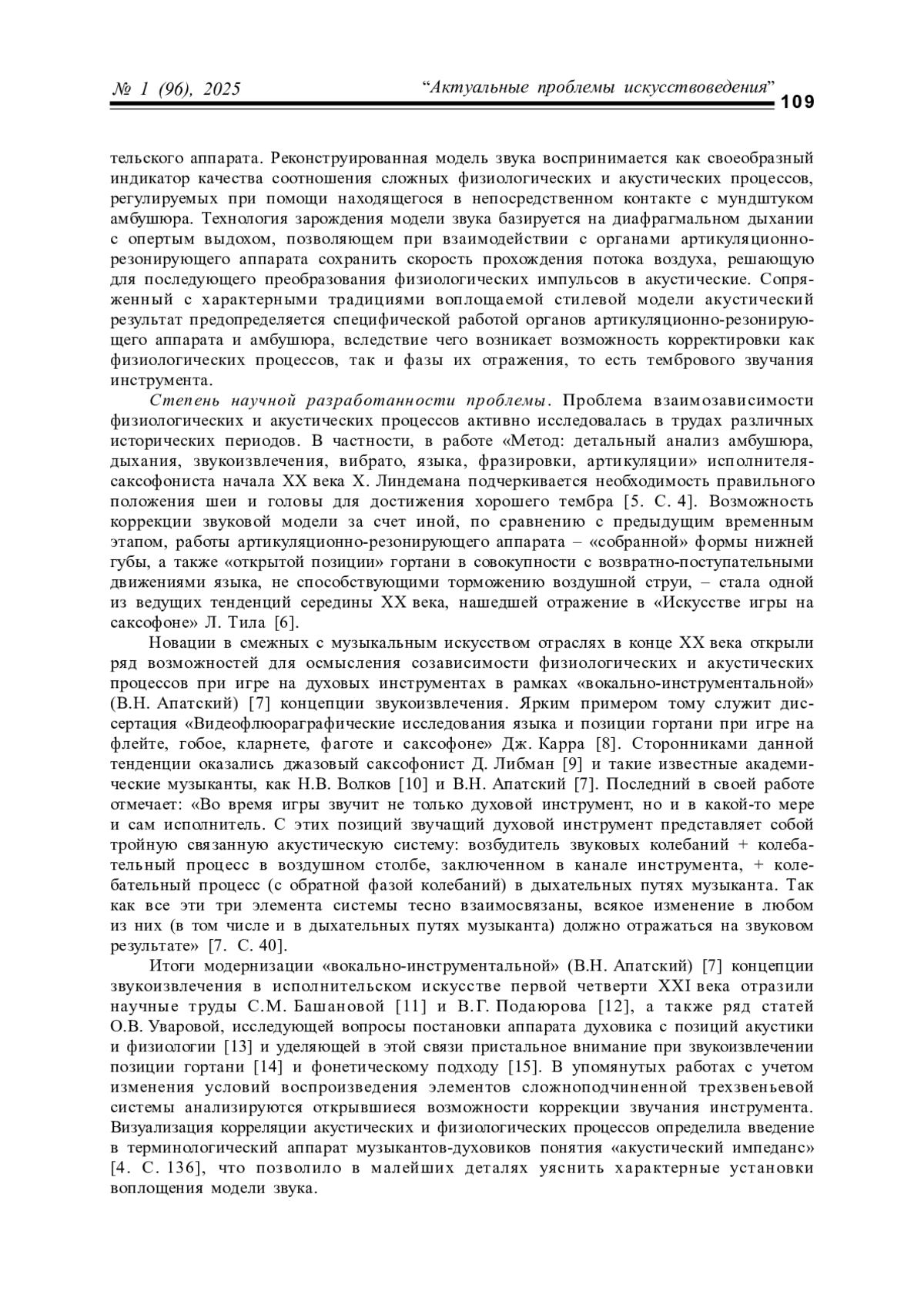 Актуальность темы исследования. Специфика бытования саксофона в музыкальном социуме со дня создания и вплоть до первой половины XX столетия [1] – не увенчавшиеся успехом попытки внедрения в оперно-симфонический и духовой оркестры с целью расширения тембровых, технических и динамических возможностей, наряду со случайным утверждением в качестве полноправного лидирующего участника в сфере джазового искусства, – обусловила существующие до настоящего времени закономерности исполнительства на данном инструменте. Одной из характерных тенденций, однако, в свете современных процессов не являющейся главенствующей, остается разграничение мировой саксофонной агломерации на академическое и джазовое пространства, размытость границ которых позволяет не только одновременное функционирование в единой плоскости (в силу унифицирования комплекса профессиональных навыков), но и параллельное развитие в рамках избранных направлений. В этой связи, согласно стилевой принадлежности, корректируется диапазон саксофонных традиций [2], влияющих на формирование «исполнительской семантики» (Н. Е. Костенко) [цит. по: 1] и «темброво-звуковой» модели (И. В. Вискова) [3], акустический результат которых предрешается происходящими в организме музыканта физиологическими процессами, соотносящимися по закону акустического импеданса