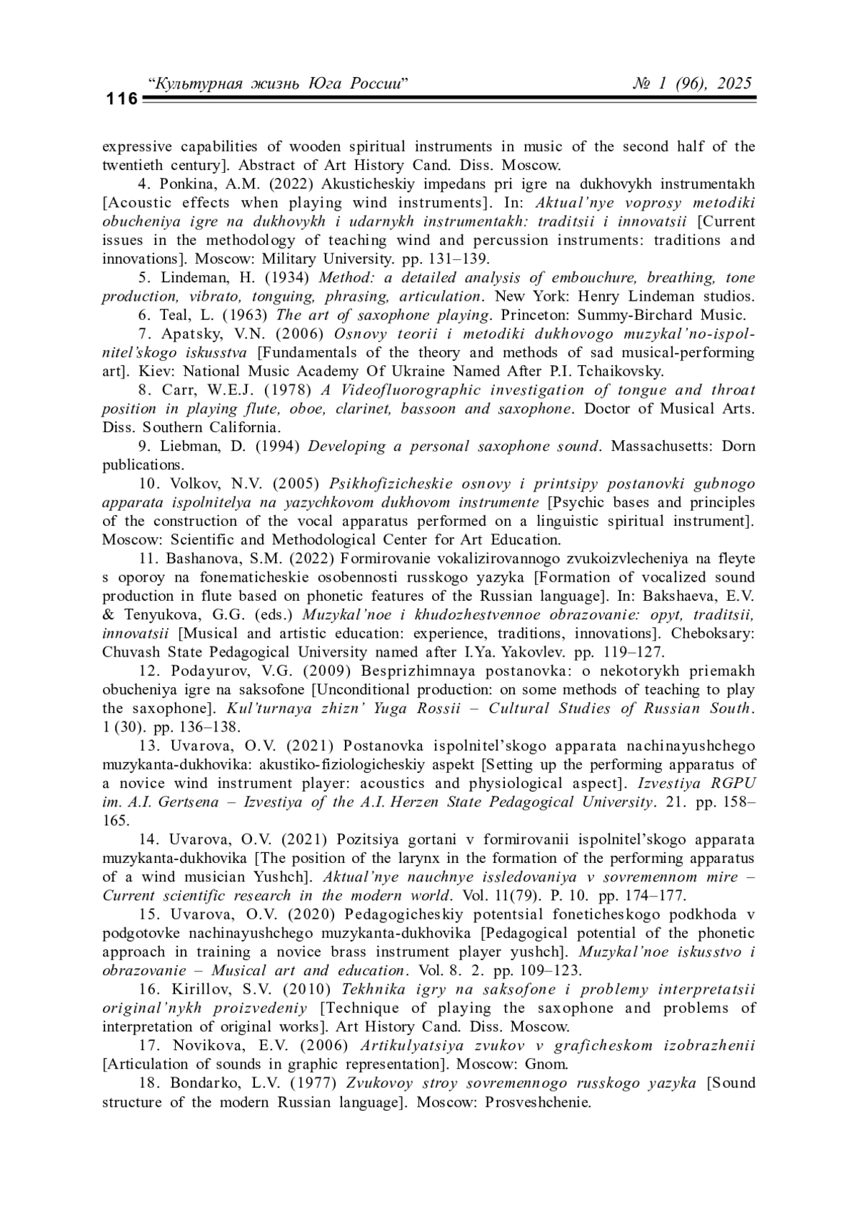 2. Понькина А.М. Русские саксофонные традиции: к проблеме генезиса // Образование и культурное пространство. 2024. № 1. С. 96-104. EDN: NINKMO