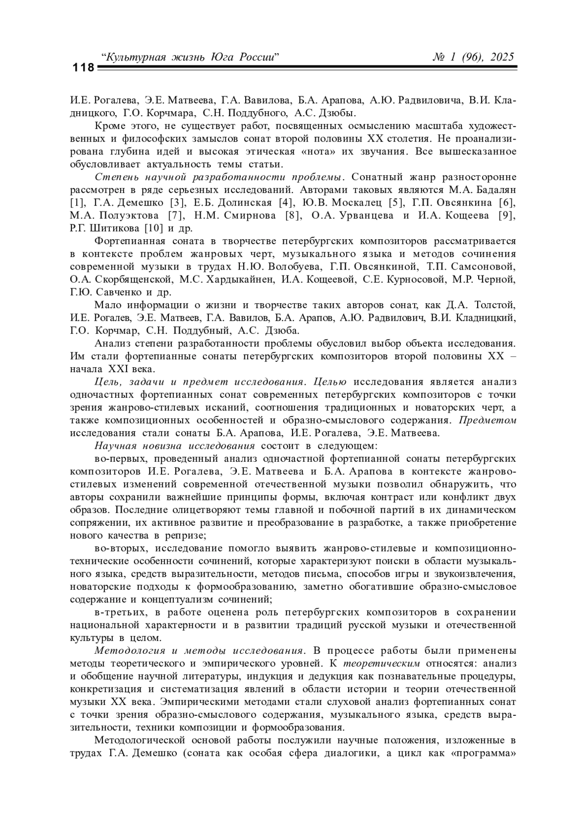 ЛИ Ц. ОДНОЧАСТНЫЕ СОНАТЫ ПЕТЕРБУРГСКИХ КОМПОЗИТОРОВ И. Е. РОГАЛЕВА, Э. Е. МАТВЕЕВА, Б. А. АРАПОВА: ОБРАЗНО-ДРАМАТУРГИЧЕСКИЕ И КОМПОЗИЦИОННЫЕ АСПЕКТЫ // КУЛЬТУРНАЯ ЖИЗНЬ ЮГА РОССИИ. 2025. № 1 (96)