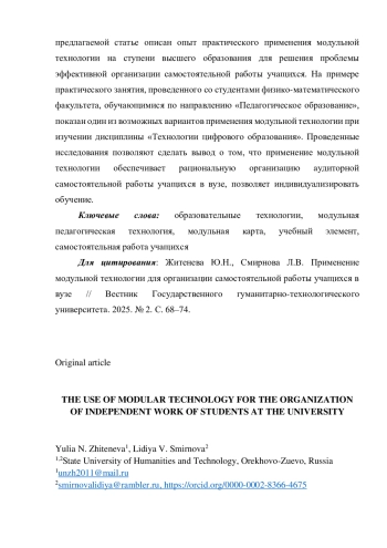 Одной из актуальных проблем педагогической практики в вузе является эффективная организация практических или лабораторных занятий. Возможным решением упомянутой проблемы является эффективная организация самостоятельной работы учащихся во время таких занятий. Модульная технология является одним из инструментов, позволяющих развивать и активно использовать в образовательном процессе навыки самостоятельной работы учащихся. Данная технология используется как на уровне общего образования, так и в профессиональном образовании. Анализ источников по теме применения модульной технологии в образовании свидетельствует о том, что вопросы, связанные с применением указанной технологии для организации самостоятельной работы студентов в высшем учебном заведении, слабо изучены. Как правило, исследования, затрагивающие проблемы применения модульной технологии в вузе, посвящены различным аспектам разработки модульных программ. В предлагаемой статье описан опыт практического применения модульной технологии на ступени высшего образования для решения проблемы эффективной организации самостоятельной работы учащихся. На примере практического занятия, проведенного со студентами физико-математического факультета, обучающимися по направлению «Педагогическое образование», показан один из возможных вариантов применения модульной технологии при изучении дисциплины «Технологии цифрового образования». Проведенные исследования позволяют сделать вывод о том, что применение модульной технологии обеспечивает рациональную организацию аудиторной самостоятельной работы учащихся в вузе, позволяет индивидуализировать обучение.