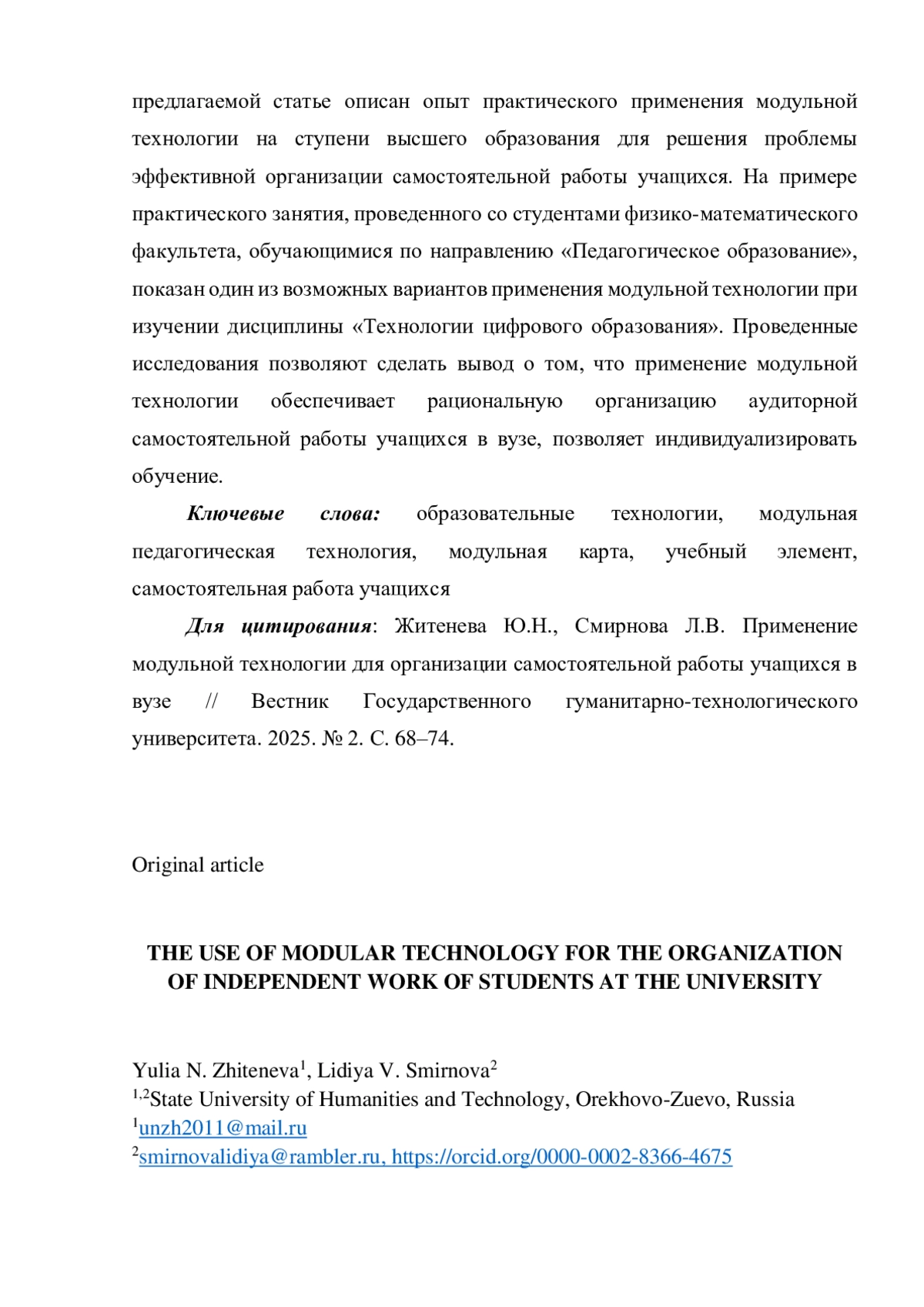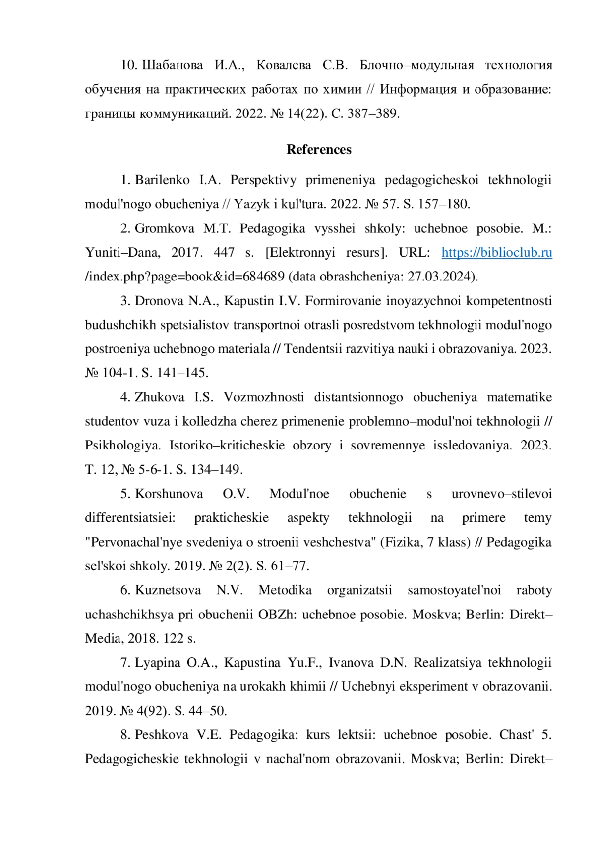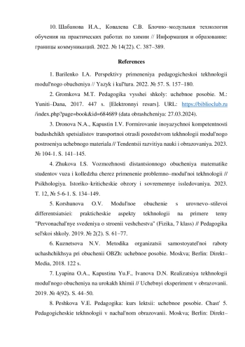 1. Бариленко И.А. Перспективы применения педагогической технологии модульного обучения // Язык и культура. 2022. № 57. С. 157-180.