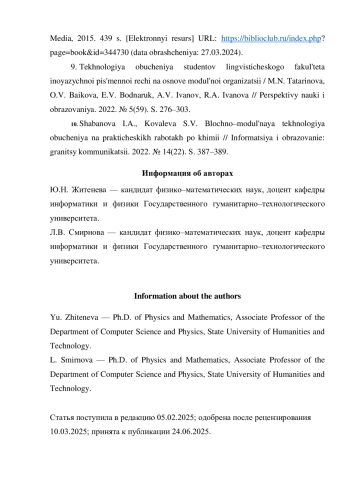 10. Шабанова И.А., Ковалева С.В. Блочно-модульная технология обучения на практических работах по химии // Информация и образование: границы коммуникаций. 2022. № 14(22). С. 387-389. EDN: VLYOPE