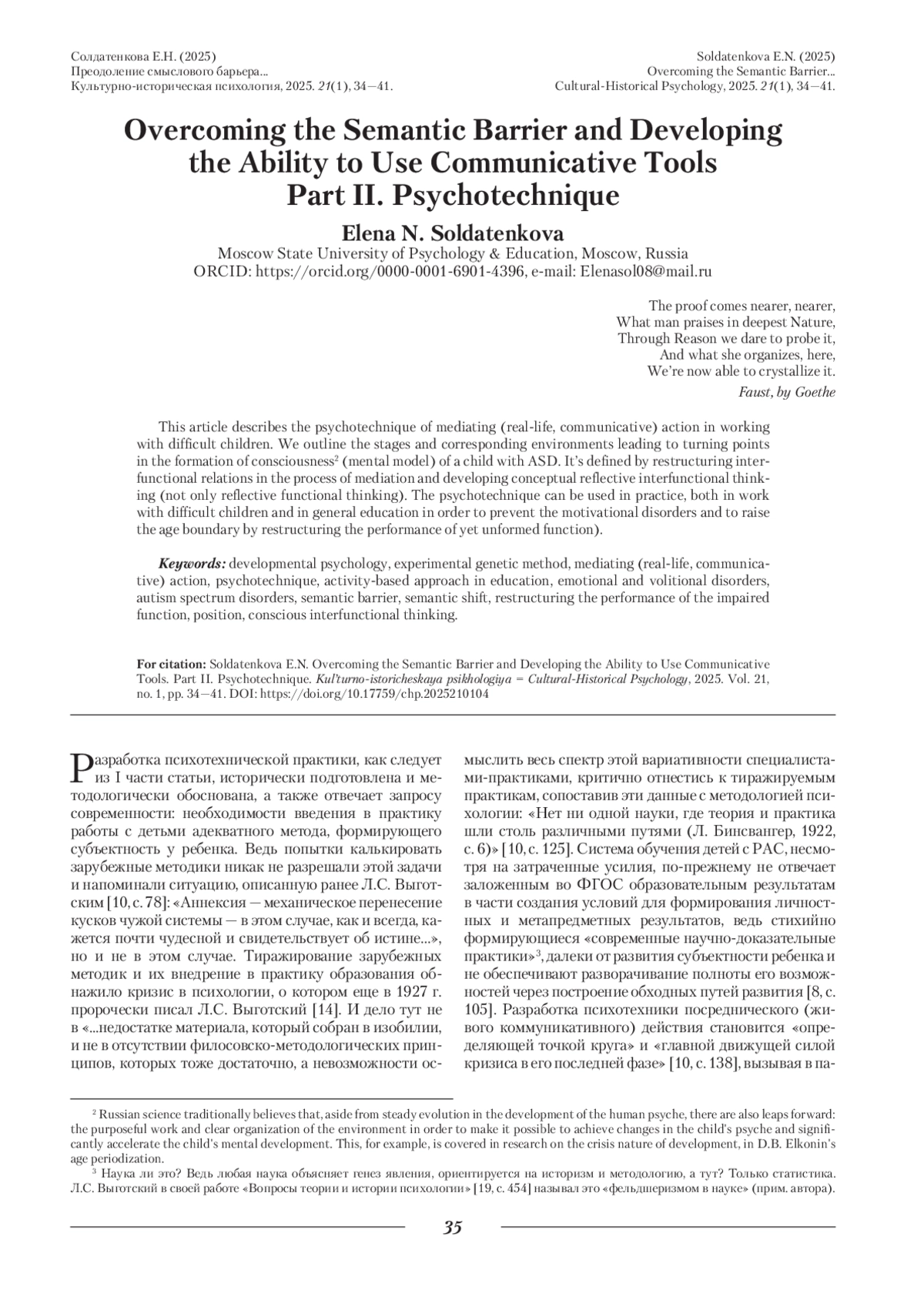 В статье описана психотехника посреднического (живого коммуникативного) действия в работе с трудным детством. Обозначены этапы и соответствующие им условия работы, ведущие к повороту в формировании сознания1 (модели психического) ребенка с РАС, которые определяются перестройкой характера межфункциональных отношений в процессе опосредствования и развитием понятийного рефлексивного межфункционального мышления (не лишь отражающего функционального). Психотехника может быть использована как в практике работы с трудным детством, так и в практике общего образования (с целью предупреждения возникновения мотивационных нарушений и повышения границы возраста: через перестройку способа реализации пока не сформированной функции).