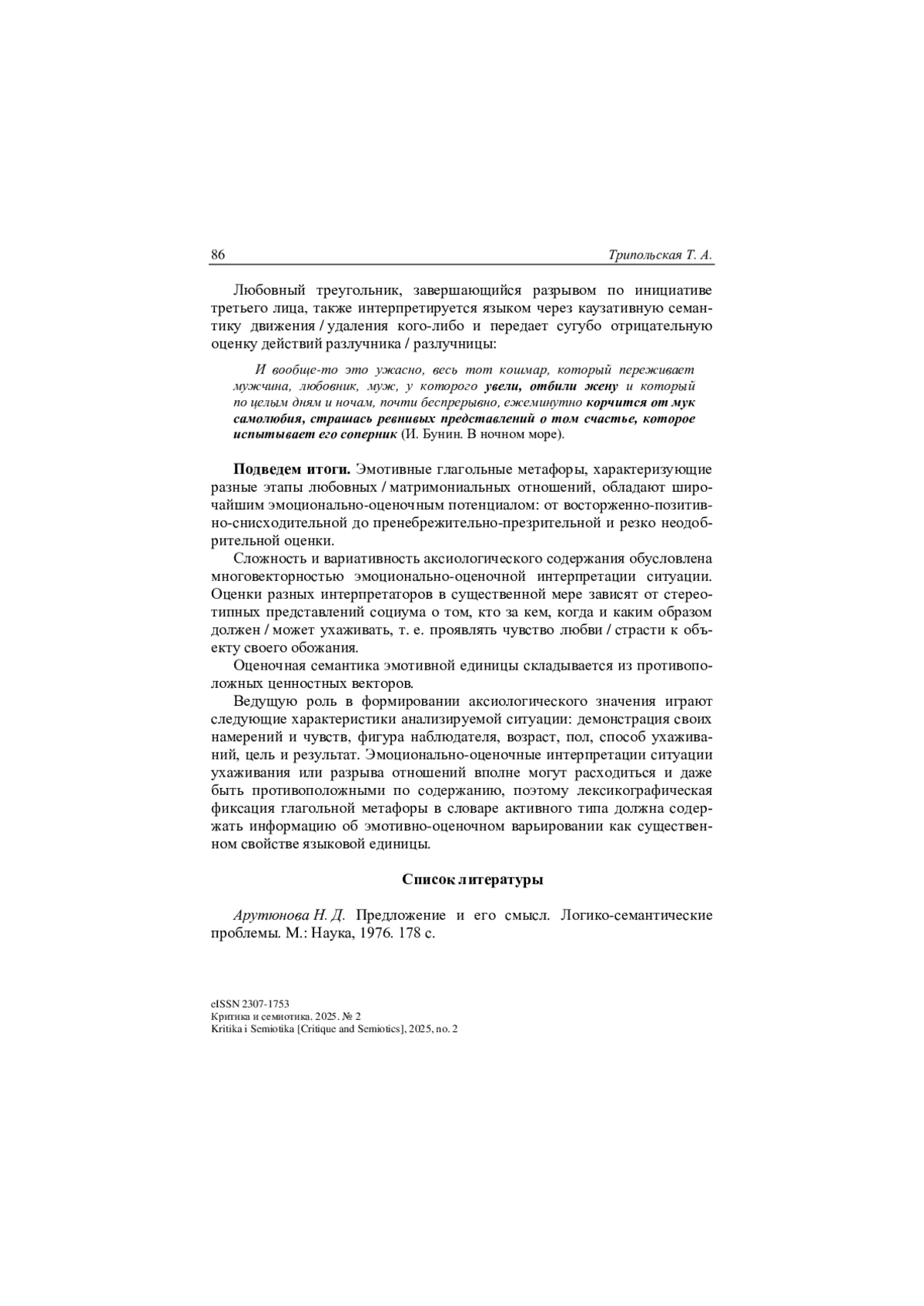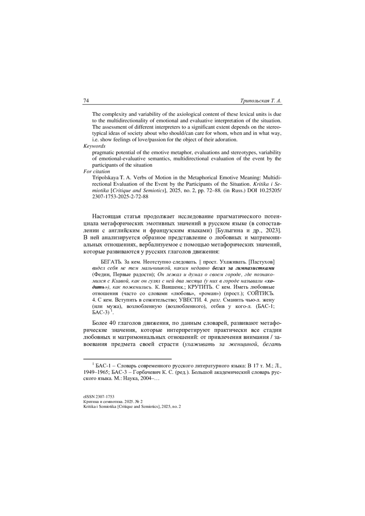 - Булыгина Е. Ю., Смолина М. Б., Трипольская Т. А. Глаголы движения в метафорическом эмотивном значении: сопоставительный аспект // Через «чужое» к «своему»: диалог русской и венгерской культур: Коллективная монография / Под ред. М. А. Лаппо, В. В. Мароши. Новосибирск: Изд-во НГПУ, 2023. С. 21–54.