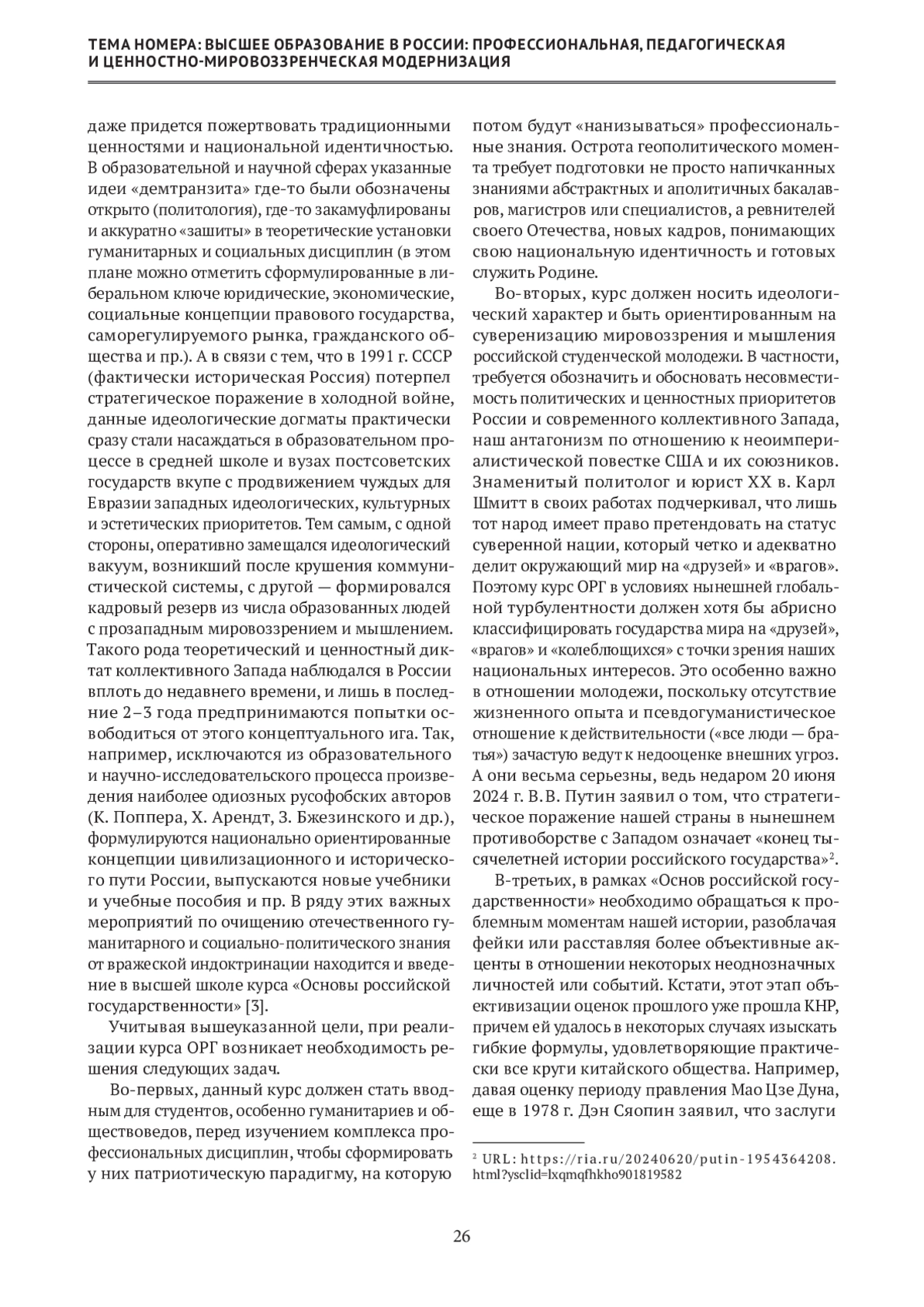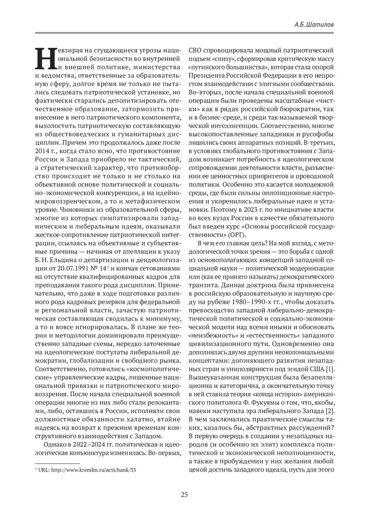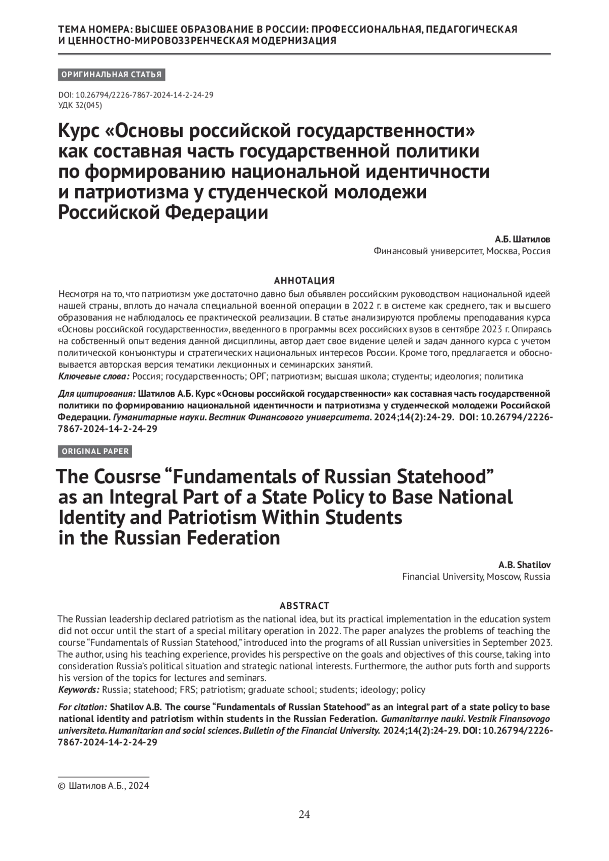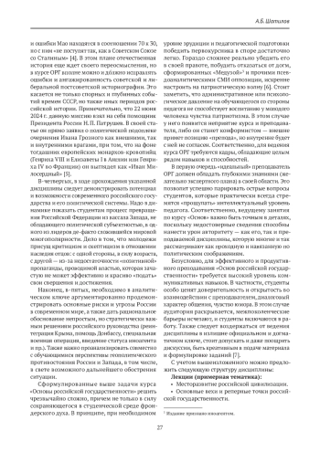 Несмотря на то, что патриотизм уже достаточно давно был объявлен российским руководством национальной идеей нашей страны, вплоть до начала специальной военной операции в 2022 г. в системе как среднего, так и высшего образования не наблюдалось ее практической реализации. В статье анализируются проблемы преподавания курса «Основы российской государственности», введенного в программы всех российских вузов в сентябре 2023 г. Опираясь на собственный опыт ведения данной дисциплины, автор дает свое видение целей и задач данного курса с учетом политической конъюнктуры и стратегических национальных интересов России. Кроме того, предлагается и обосновывается авторская версия тематики лекционных и семинарских занятий.