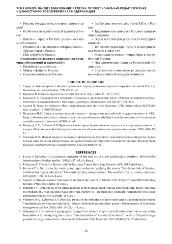 3. Борзова Т. А. Возвращение к истокам: о подходах к преподаванию курса «Основы российской государственности в высшей школе». Мир науки, культуры, образования. 2023;4(101):138-142.