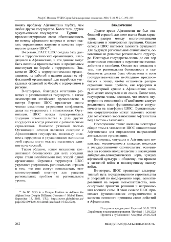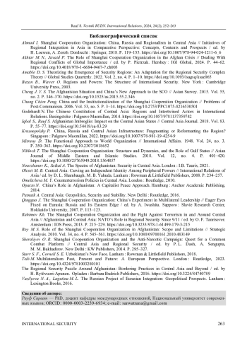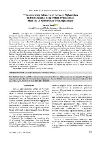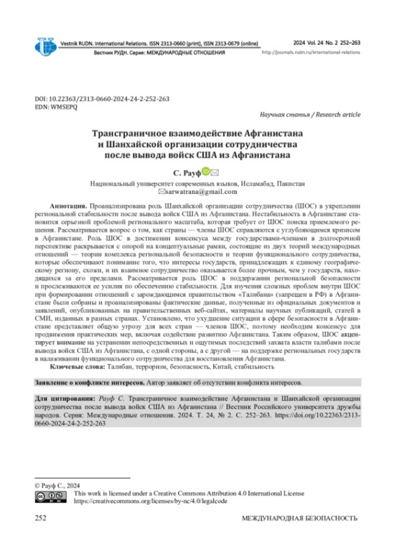 РАУФ С. ТРАНСГРАНИЧНОЕ ВЗАИМОДЕЙСТВИЕ АФГАНИСТАНА И ШАНХАЙСКОЙ ОРГАНИЗАЦИИ СОТРУДНИЧЕСТВА ПОСЛЕ ВЫВОДА ВОЙСК США ИЗ АФГАНИСТАНА // ВЕСТНИК РОССИЙСКОГО УНИВЕРСИТЕТА ДРУЖБЫ НАРОДОВ. СЕРИЯ: МЕЖДУНАРОДНЫЕ ОТНОШЕНИЯ. 2024. ТОМ 24 № 2