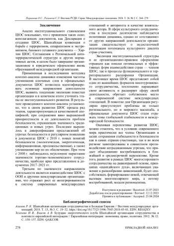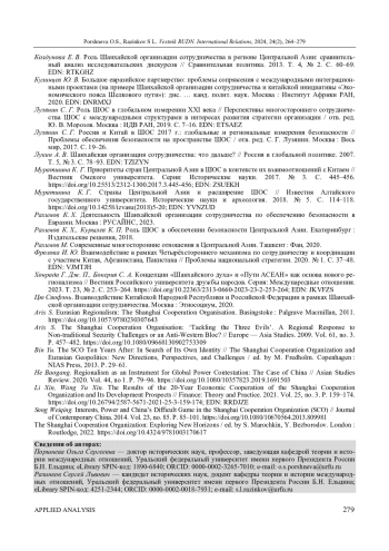 3. Колдунова Е. В. Роль Шанхайской организации сотрудничества в регионе Центральной Азии: сравнительный анализ исследовательских дискурсов // Сравнительная политика. 2013. Т. 4, № 2. С. 60-69. EDN: RTKGHZ