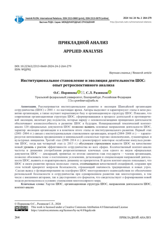 Рассматривается институциональное развитие и эволюция Шанхайской организации сотрудничества (ШОС) с 2001 г. по настоящее время. Авторы выделяют и характеризуют этапы и вехи развития организации, а также изучают нормативную базу и организационную структуру ШОС. Показано, что современная организационная структура ШОС, сформировавшаяся в процессе длительной и противоречивой эволюции, включает ряд подсистем, которые наряду с основополагающими принципами деятельности обеспечивают жизнеспособность и развитие ШОС в будущем. Ненаправленный тематический контент-анализ 120 официальных документов ШОС позволил выявить основные направления деятельности ШОС, характер эволюции организации и в конечном итоге этапы ее институционального развития. Первый этап (2001-2004 гг.) связан с институциональным становлением организации, второй (2004-2008 гг.) - характеризуется интенсивным продвижением и минимальной сложностью торгово-экономических, гуманитарных и культурных инициатив. Третий этап (2008-2014 гг.) демонстрирует некоторое ослабление импульса развития ШОС, тогда как четвертый этап (с 2015 г.) обусловлен стремлением вывести ШОС на качественно новый уровень с ростом эффективности сотрудничества во всех сферах. Количественный контент-анализ частоты и динамики употребления репрезентативных ключевых слов одного из видов официальных документов ШОС - деклараций, принятых по итогам саммитов глав государств - членов организации, позволил обосновать тезис о постепенном усложнении, детализации и специализации направлений деятельности ШОС, выявить и охарактеризовать динамику ее приоритетов. В целом контент-анализ показывает, что ШОС в своем развитии прошла несколько этапов, отличающихся качественной спецификой, сохраняя при этом четкий приоритет вопросов безопасности, отражающий значимость традиционных и новых угроз. Сделан вывод о функционировании на платформе ШОС многоуровневого взаимодействия по обеспечению региональной безопасности и сотрудничества при одновременном развитии как многосторонних, в том числе с внешними акторами, так и двусторонних его форматов, что свидетельствует о формировании новой модели регионализма в условиях становления многополярного мира.