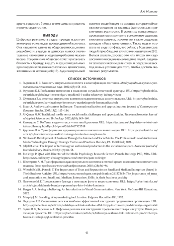 1. Зырянова Е. С. Важность визуального контента и классификация его типов. Международный журнал гуманитарных и естественных наук. 2022;6(3):158-161.