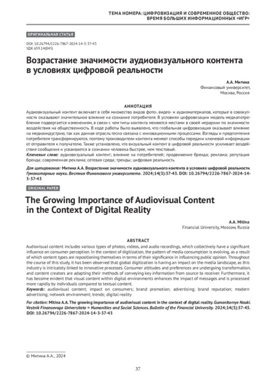 Аудиовизуальный контент включает в себя множество видов фото-, видео- и аудиоматериалов, которые в совокупности оказывают значительное влияние на сознание потребителя. В условиях цифровизации модель медиапотребления подвергается изменениям, в связи с чем типы контента меняются местами в своей иерархии по значимости воздействия на общественность. В ходе работы было выявлено, что глобальная цифровизация оказывает влияние на медиаиндустрию, так как данная отрасль тесно связана с инновационными процессами. Взгляды и предпочтения потребителя трансформируются, поэтому производители контента меняют способы передачи ключевой информации от отправителя к получателю. Также установлено, что визуальный контент в цифровой реальности усиливает воздействие сообщения и усваивается в сознании человека быстрее, чем текстовый.