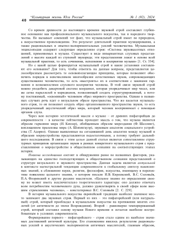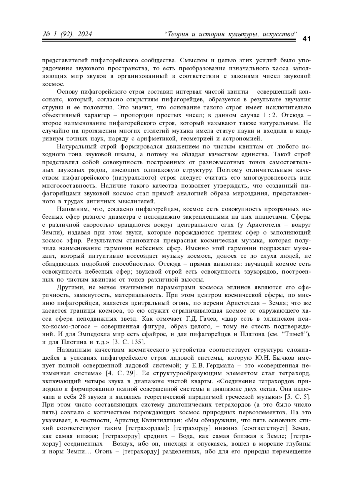 В статье сопоставляются структурные принципы организации звуков в рамках конкретного музыкального строя с представлениями о мироустройстве в общественном сознании на соответствующих этапах истории. Так как ведущая функция музыкального строя состоит в преобразовании естественного хаоса звуков в организованный звуковой космос, структура звукового строя отвечает тем представлениям о мироустройстве, которые преобладают в общественном сознании соответствующей исторической эпохи. Аргументами, доказывающими данное утверждение, выступают характеристики двух наиболее значимых для европейской музыкальной культуры способов «построения» звучаний – натурального (пифагорейского) строя и равномерно темперированного строя