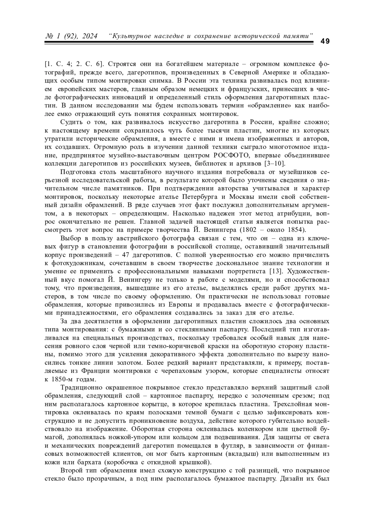 Статья посвящена проблеме атрибуции произведений ранней русской фотографии. На примере дагеротипов Й. Венингера рассматривается возможность использования обрамлений для определения авторства. Выделяются и описываются основные типы монтировок, предпринимается попытка расположить их в хронологической последовательности; попутно поднимаются актуальные атрибуционные вопросы. Акцентируется внимание на противоречиях, возникающих при изучении дагеротипов, и на проблемах, связанных с опытом реконструкции утраченных обрамлений. Отсутствие исследований, посвященных изучению дагеротипных обрамлений, делает настоящую статью чрезвычайно актуальной