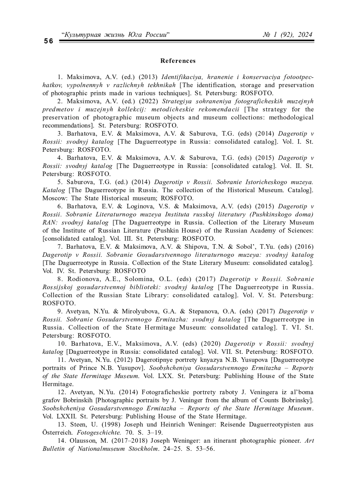 4. Дагеротип в России: [сводный каталог] / общ. ред. и сост.: Е.В. Бархатова, А.В. Максимова, Т.Г. Сабурова. СПб.: РОСФОТО, 2015. Т. II. 228 с.