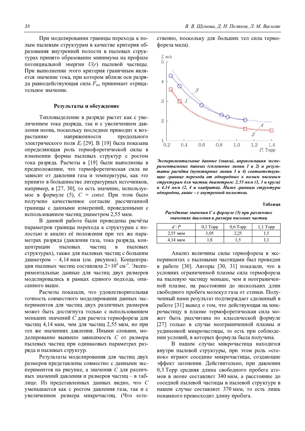 Экспериментально получена линия перехода однородных сплошных пылевых структур к структурам с полостью (войдом) в координатах «давление – ток разряда» в тлеющем разряде в неоне для микрочастиц двух размеров. Проведенное моделирование линии перехода с помощью диффузионно-дрейфовой модели положительного столба разряда в неоне с учетом градиента температуры показало, что сила термофореза, действующая на микрочастицы, связана с размером микрочастиц и параметрами пылевых структур более сложным образом, чем предсказывает классическая теория для уединенной частицы в неограниченной плазме.