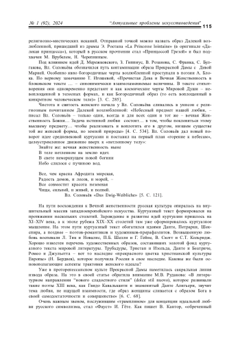 В статье рассматривается образ Далекой возлюбленной в романсах С. Рахманинова ор. 38 на стихи поэтов-символистов. В музыкальной науке проблема Русского Эроса на сегодняшний день не получила должного освещения. Цель статьи – выявить в романсах С. Рахманинова образы-знаки куртуазного текста. Подвергнув анализу романсы «К ней» и «Ау!», автор обнаружил, что в драматургии романсов отражен новый тип любовной лирики – синтез возвышенно-одухотворенного и религиозно-мистического начал, который соответствовал концепции «Вечной Женственности» Вл. Соловьёва