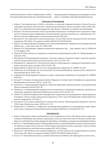 17. Чернявский А. Г., Олейник С. А. Дефиниция «международный терроризм» в международном праве. Юридическая наука и практика: Вестник Нижегородской академии МВД России. 2018;4(44):322-327.