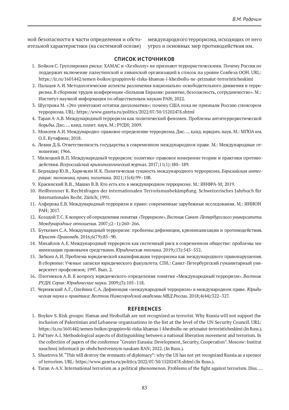 12. Козодой Т. С. К вопросу об определении понятия «Терроризм». Вестник Санкт-Петербургского университета. Международные отношения. 2007;(2-1):260-266.