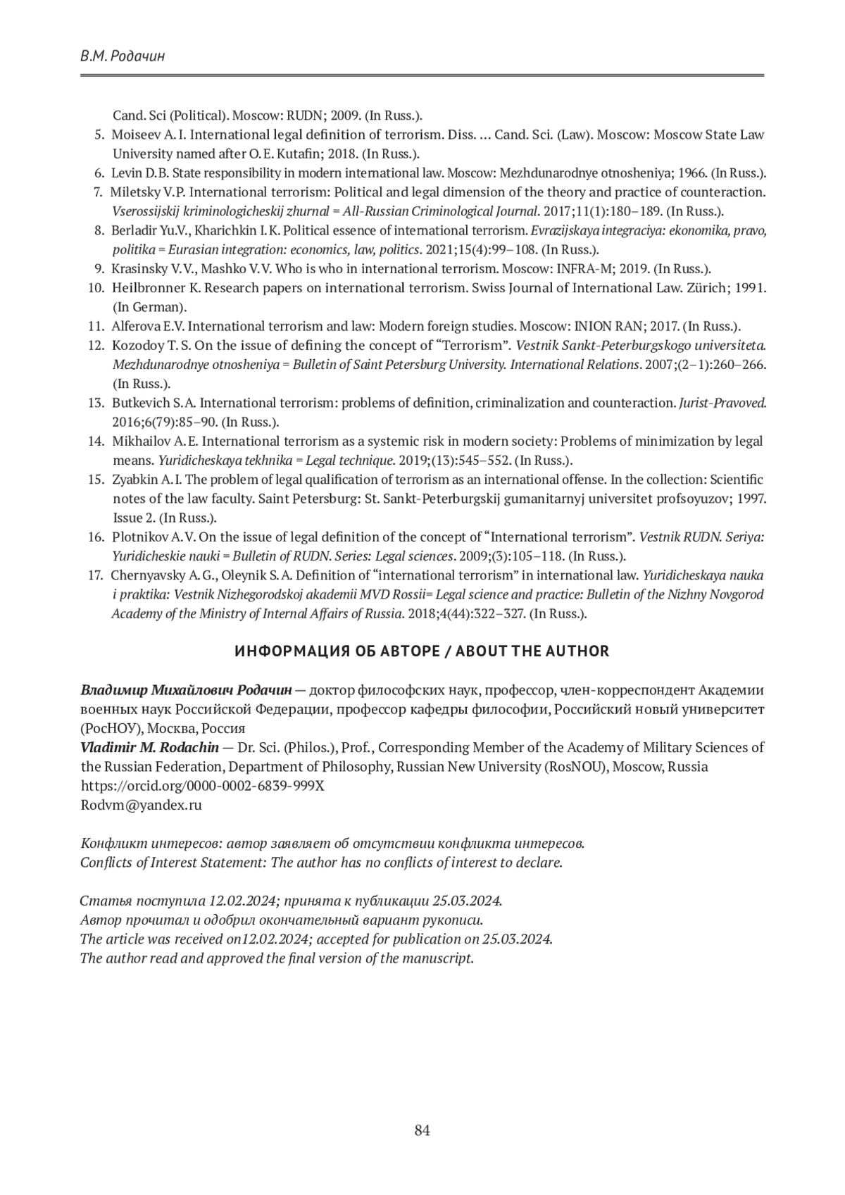 5. Моисеев А. И. Международно-правовое определение терроризма. Дис. … канд. юридич. наук. М.: МГЮА им. О. Е. Кутафина; 2018.