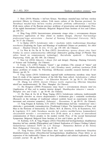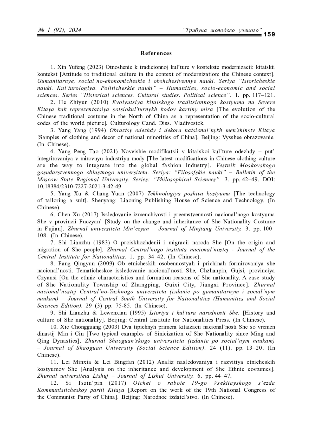 12. Ли Минся, Лэй Бинфань. Анализ наследования и развития этнических костюмов Шэ // Журнал университета Лишуй. 2012. № 6. С. 44-47. (На кит. яз.).