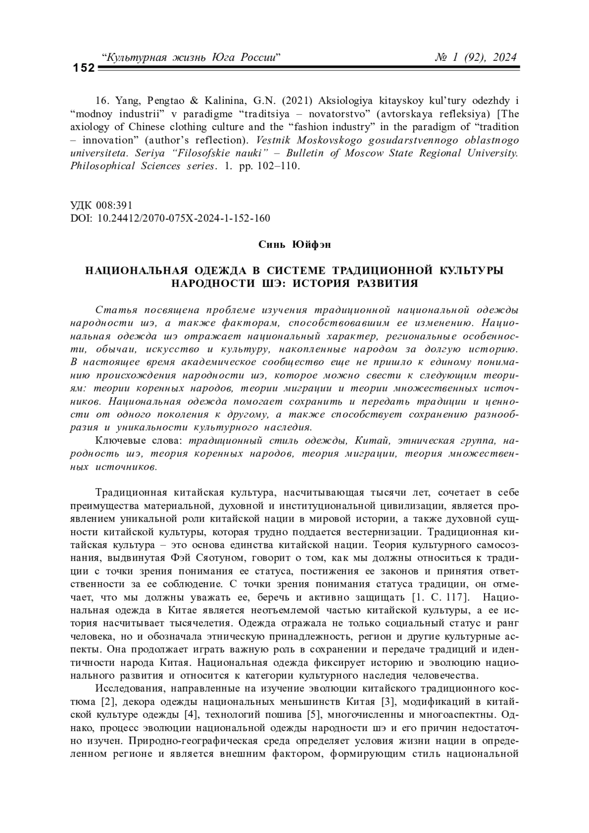 Традиционная китайская культура, насчитывающая тысячи лет, сочетает в себе преимущества материальной, духовной и институциональной цивилизации, является проявлением уникальной роли китайской нации в мировой истории, а также духовной сущности китайской культуры, которая трудно поддается вестернизации. Традиционная китайская культура – это основа единства китайской нации. Теория культурного самосознания, выдвинутая Фэй Сяотуном, говорит о том, как мы должны относиться к традиции с точки зрения понимания ее статуса, постижения ее законов и принятия ответственности за ее соблюдение. С точки зрения понимания статуса традиции, он отмечает, что мы должны уважать ее, беречь и активно защищать [1. С. 117]. Национальная одежда в Китае является неотъемлемой частью китайской культуры, а ее история насчитывает тысячелетия. Одежда отражала не только социальный статус и ранг человека, но и обозначала этническую принадлежность, регион и другие культурные аспекты. Она продолжает играть важную роль в сохранении и передаче традиций и идентичности народа Китая. Национальная одежда фиксирует историю и эволюцию национального развития и относится к категории культурного наследия человечества.