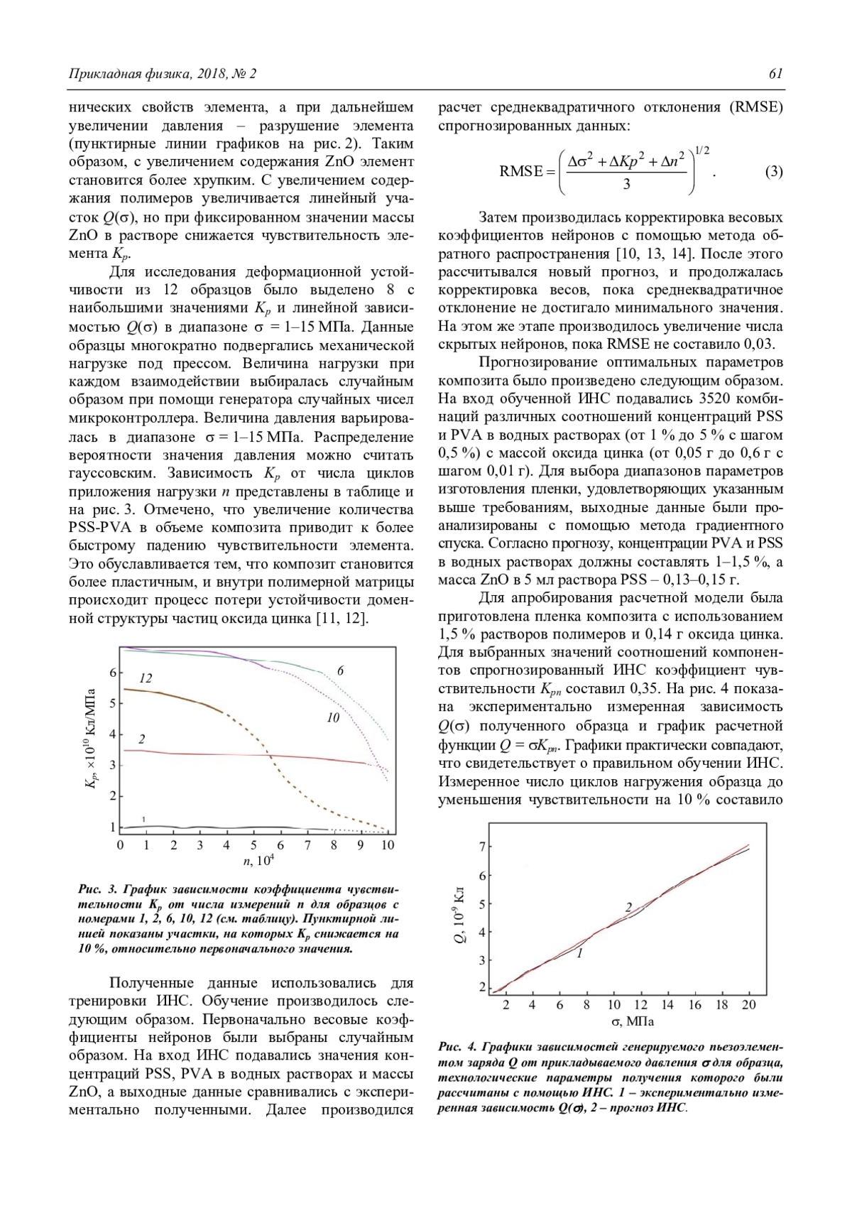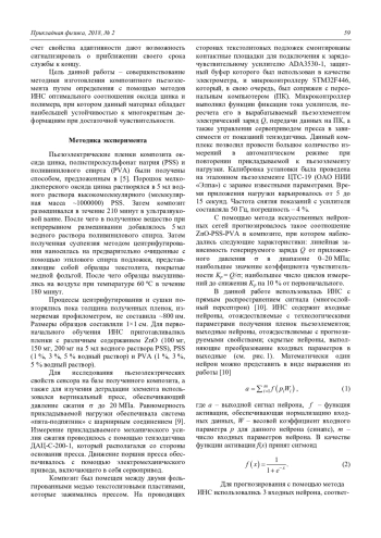 В результате проведенного исследования были получены образцы пьезоэлектрических пленок на базе композита оксида цинка и полимерных электролитов. Низкотемпературная технология изготовления позволяет наносить пленки на гибкие подложки, что существенно расширяет область применения сенсоров, выполненных на их основе. В ходе работы была показана применимость математических методов искусственных нейронных сетей для расчета пьезоэлектрических свойств композита и срока его службы на основании данных о технологических параметрах изготовления элемента. Результаты, полученные с помощью ИНС, позволили усовершенствовать методику изготовления пьезоэлемента путем определения оптимальных соотношений оксида цинка-PSS-PVA, при котором данный материал обладает линейными характеристиками, приемлемой чувствительностью и устойчивостью к многократным нагрузкам.