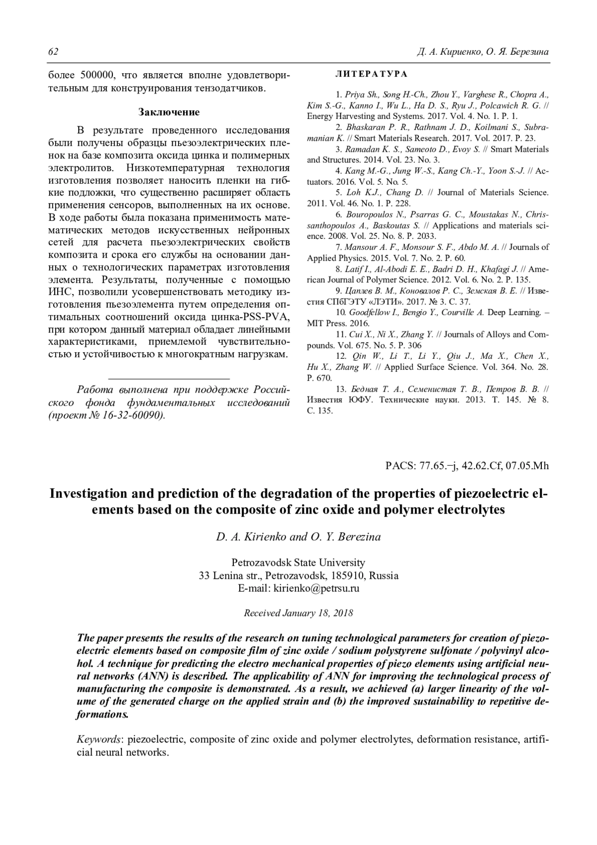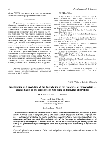 D. A. Kirienko and O. Y. Berezina Investigation and prediction of the degradation of the properties of piezoelectric elements based on the composite of zinc oxide and polymer electrolytes 58