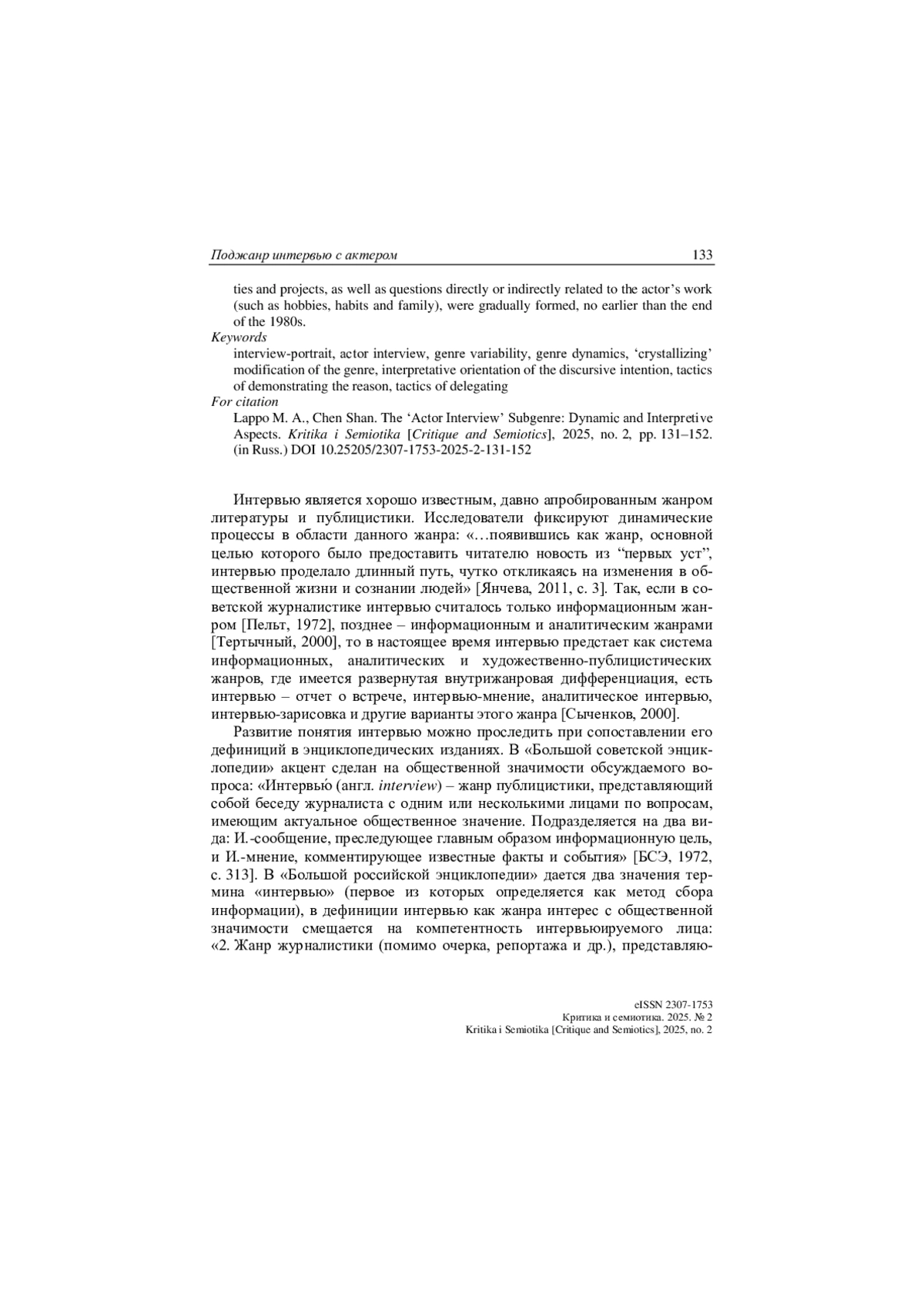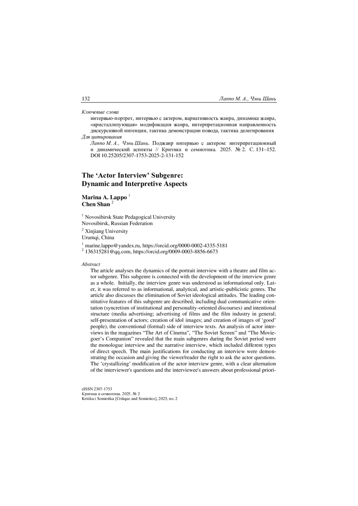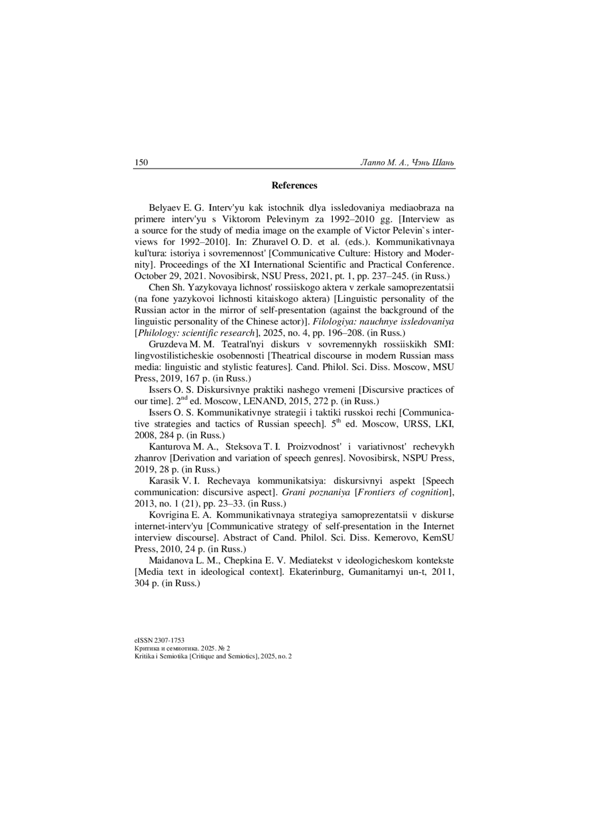 20. Чэнь Ш. Языковая личность российского актера в зеркале самопрезентации (на фоне языковой личности китайского актера) // Филология: научные исследования. 2025. № 4. С. 196-208.