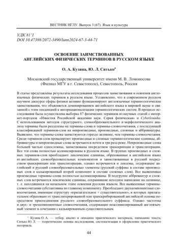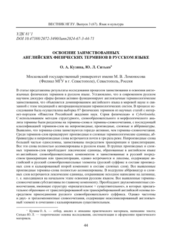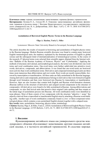 В статье представлены результаты исследования процессов заимствования и освоения англоязычных физических терминов в русском языке. Установлено, что в современном русском научном дискурсе сферы физики активно функционируют англоязычные терминологические заимствования, что объясняется доминированием английского языка в мировой науке и связанной с этим тенденцией к интернационализации терминологических систем. В процессе исследования была осуществлена выборка 87 физических терминов из научных статей с интернет-порталов «Известия Российской академии наук. Серия физическая» и Cyberleninka. С использованием методов структурного, словообразовательного и морфологического анализа термины были разделены на термины-слова и термины-словосочетания, с последующей классификацией терминов-слов на непроизводные, производные, сложные и аббревиатуры. Выявлено, что термины-слова заимствуются гораздо активнее, чем термины-словосочетания. Среди терминов-слов превалируют производные и сложные терминологические единицы, аббревиатуры и непроизводные слова встречаются почти в три раза реже. Непроизводные слова большей частью односложны, заимствованы посредством транскрипции и транслитерации. Все эти слова полностью ассимилированы в русском языке. В группах производных и сложных терминов-слов преобладают лексические единицы, образованные в английском языке из английских словообразовательных компонентов и заимствованные в русский посредством транскрипции или транслитерации, однако встречаются и лексемы, содержащие английский и русский словообразовательные элементы (русский суффикс в составе производных слов и калькированный второй компонент в составе сложных слов). Все выявленные производные термины-слова полностью ассимилированы. В подгруппе аббревиатур и сложных слов встречаются лексические единицы, сохранившие исходное написание на латинице, т. е. находящиеся на начальном этапе освоения русским языком. Все выявленные термины-словосочетания субстантивны по главному компоненту. Преобладают двухкомпонентные словосочетания, имеющие структуру «прилагательное + существительное», в которых прилагательное образовано от транслитерированной или транскрибированной английской основы посредством присоединения русского словообразовательного суффикса. Однако частотны и двух- и трехкомпонентные словосочетания, содержащие неассимилированный англоязычный элемент в сочетании с калькированным существительным.