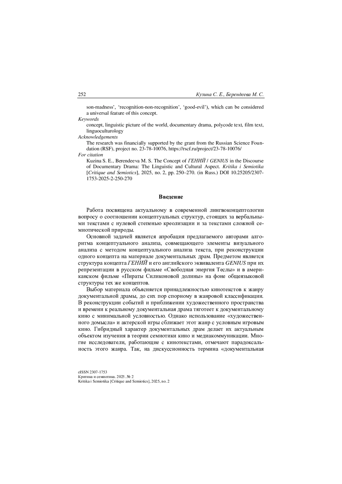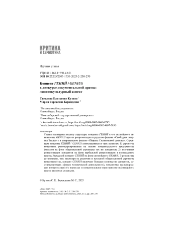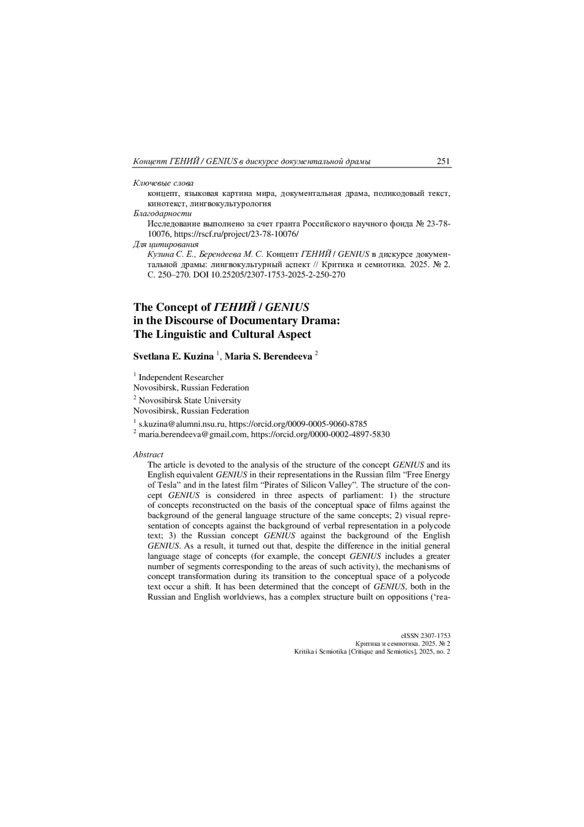 Статья посвящена анализу структуры концепта ГЕНИЙ и его английского эквивалента GENIUS при их репрезентации в русском фильме «Свободная энергия Теслы» и в американском фильме «Пираты Силиконовой долины». Структура концепта ГЕНИЙ / GENIUS сопоставляется в трех аспектах: 1) структура концептов, реконструированная на основе концептуального пространства фильмов на фоне общеязыковой структуры тех же концептов; 2) визуальная репрезентация концептов на фоне вербальной репрезентации в поликодовом тексте; 3) русский концепт ГЕНИЙ на фоне английского GENIUS. В результате установлено, что, несмотря на различия в исходной общеязыковой структуре концептов (так, концепт GENIUS включает большее количество сегментов, соответствующих сферам человеческой деятельности), механизмы трансформации концепта при его переходе в концептуальное пространство поликодового текста являются сходными.