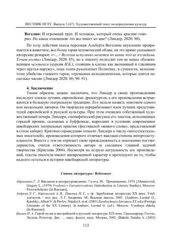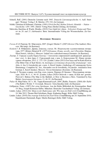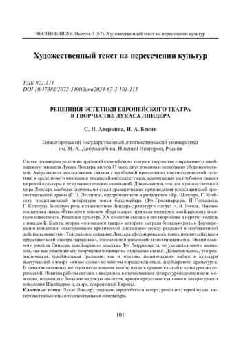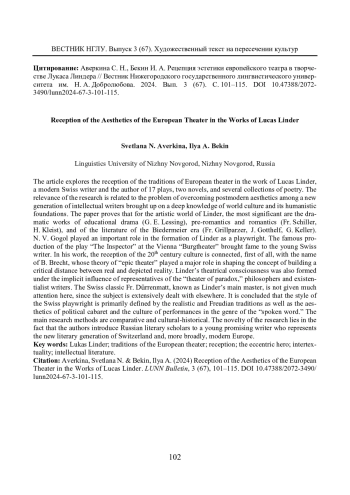 Статья посвящена рецепции традиций европейского театра в творчестве современного швейцарского писателя Лукаса Линдера, автора 17 пьес, двух романов и нескольких сборников стихов. Актуальность исследования связана с проблемой преодоления постмодернисткой эстетики в среде нового поколения писателей-интеллектуалов, воспитанных на глубоком знании мировой культуры и ее гуманистических оснований. Доказывается, что для художественного мира Линдера наиболее значимыми стали драматические произведения представителей просветительской драмы (Г. Э. Лессинга), предромантиков и романтиков (Фр. Шиллера, Г. Клейста), представителей литературы эпохи бидермайера (Фр. Грильпарцера, Й. Готхельфа, Г. Келлера). Большую роль в становлении Линдера-драматурга сыграл Н. В. Гоголь. Именно постановка пьесы «Ревизор» в венском «Бургтеатре» принесла молодому швейцарскому писателю известность. Рецепция культуры ХХ столетия связана в его творчестве в первую очередь с именем Б. Брехта, теория «эпического театра» которого сыграла большую роль в формировании концепции «выстраивания критической дистанции» между реальной и изображенной действительностью. Театральное сознание Линдера сформировалось также под воздействием представителей «театра парадокса», философов и писателей-экзистенциалистов. Имени главного учителя Линдера, швейцарского классика Фр. Дюрренматта, не уделяется много внимания, так как рецепции его творчества посвящены отдельные статьи. Делается вывод, что реалистическая, фрейдистская традиции, как и эстетика политического кабаре и культура выступлений в жанре «живое слово» во многом определили стиль швейцарского драматурга. В качестве основных методов исследования можно назвать сравнительный и культурно-исторический. Новизна работы связана с введением в отечественное литературоведение имени молодого, подающего большие надежды писателя, яркого представителя нового литературного поколения Швейцарии и, шире, современной Европы.