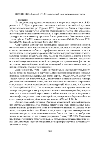 По свидетельству крупных отечественных теоретиков искусства А. Я. Гуревича и А. В. Эфроса, рождение театрального действа в европейской традиции происходило множество раз (Гуревич 1999). Причем чем ближе к современности, тем чаще фиксируются моменты происхождения театра. Эти смысловые и эстетические волны напрямую связаны с переходными моментами в истории культуры: ведь именно театр предельно близок реципиенту. Современная драматургия рубежа ХХ-ХХI веков — пример этого процесса (Schütt, Pollmann 1991; Schnell 2005; Rusterholz, Solbach 2007; Matt 2014). Современная швейцарская драматургия переживает настоящий подъем, о чем свидетельствуют многочисленные проекты, связанные с театром: это и фестивали, знакомящие публику с профессиональными постановками, и читки, позволяющие в «ускоренном» режиме и бюджетном формате представлять литературные новинки практически сразу после их публикации, а иногда и минуя этот этап, непосредственно после создания пьес. Книжные магазины предлагают огромный ассортимент современной литературы, где драма сегодня фактически не уступает короткой прозе, наиболее популярной в немецкоязычном культурном пространстве художественной форме.