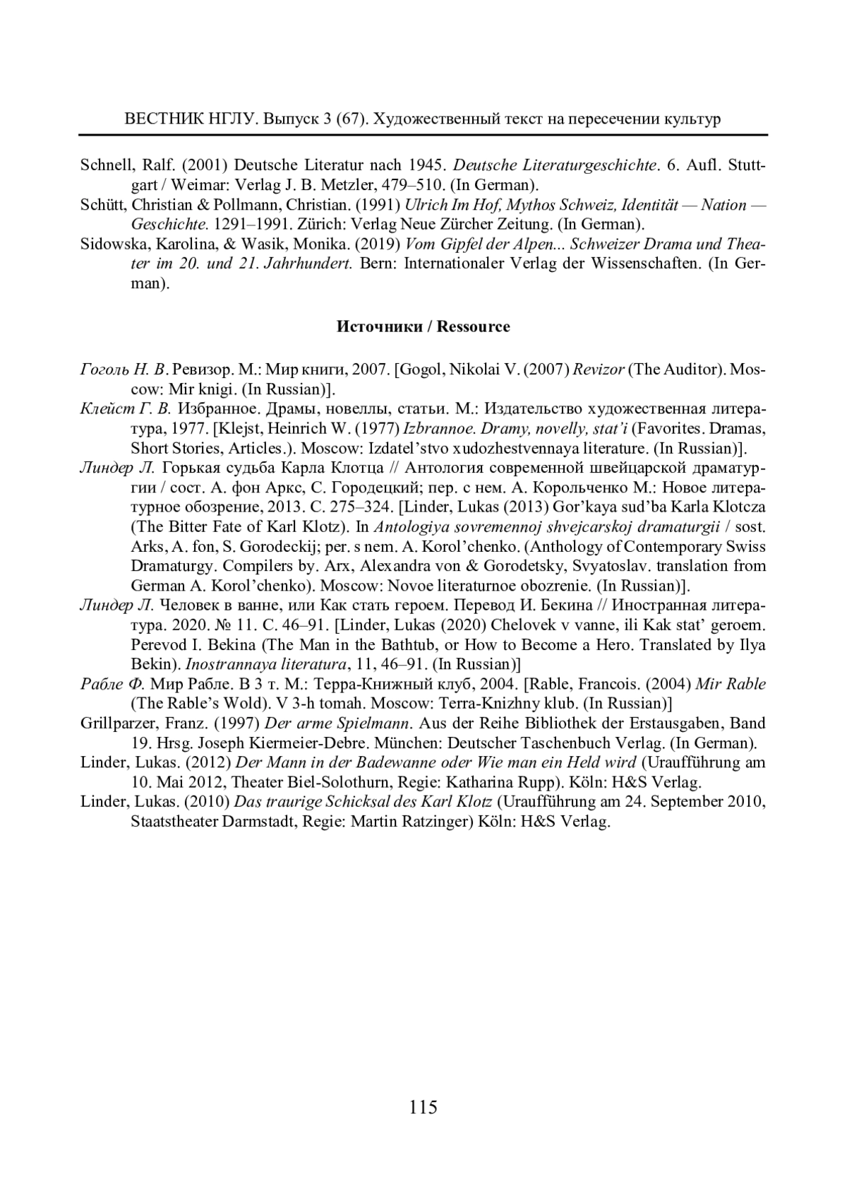 23. Линдер Л. Горькая судьба Карла Клотца // Антология современной швейцарской драматургии / сост. А. фон Аркс, С. Городецкий; пер. с нем. А. Корольченко М.: Новое литературное обозрение, 2013. С. 275-324.