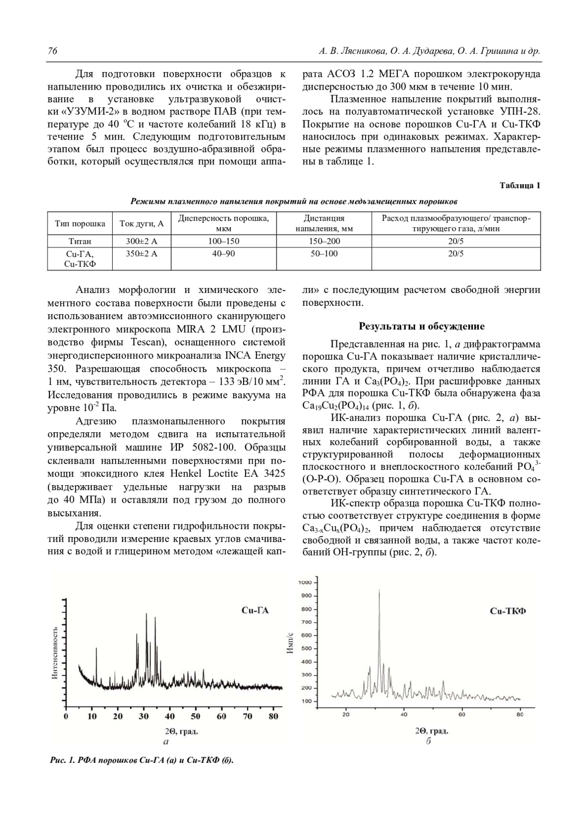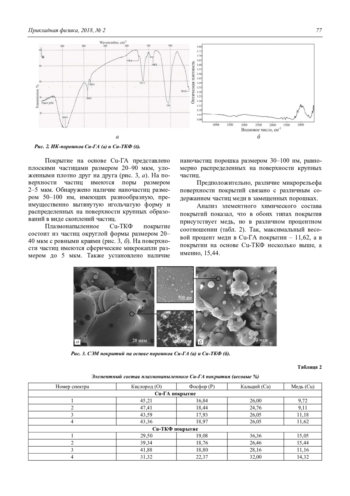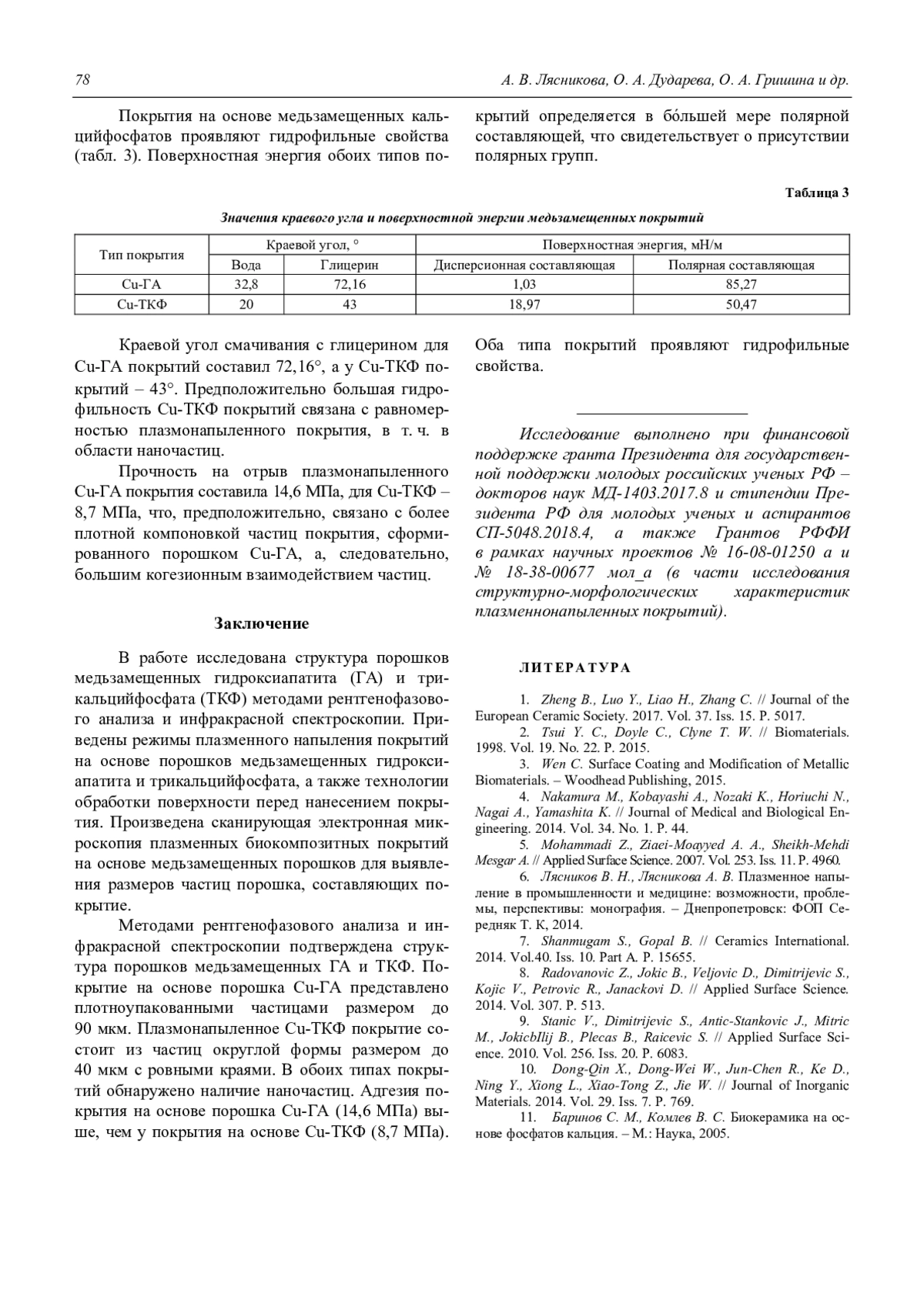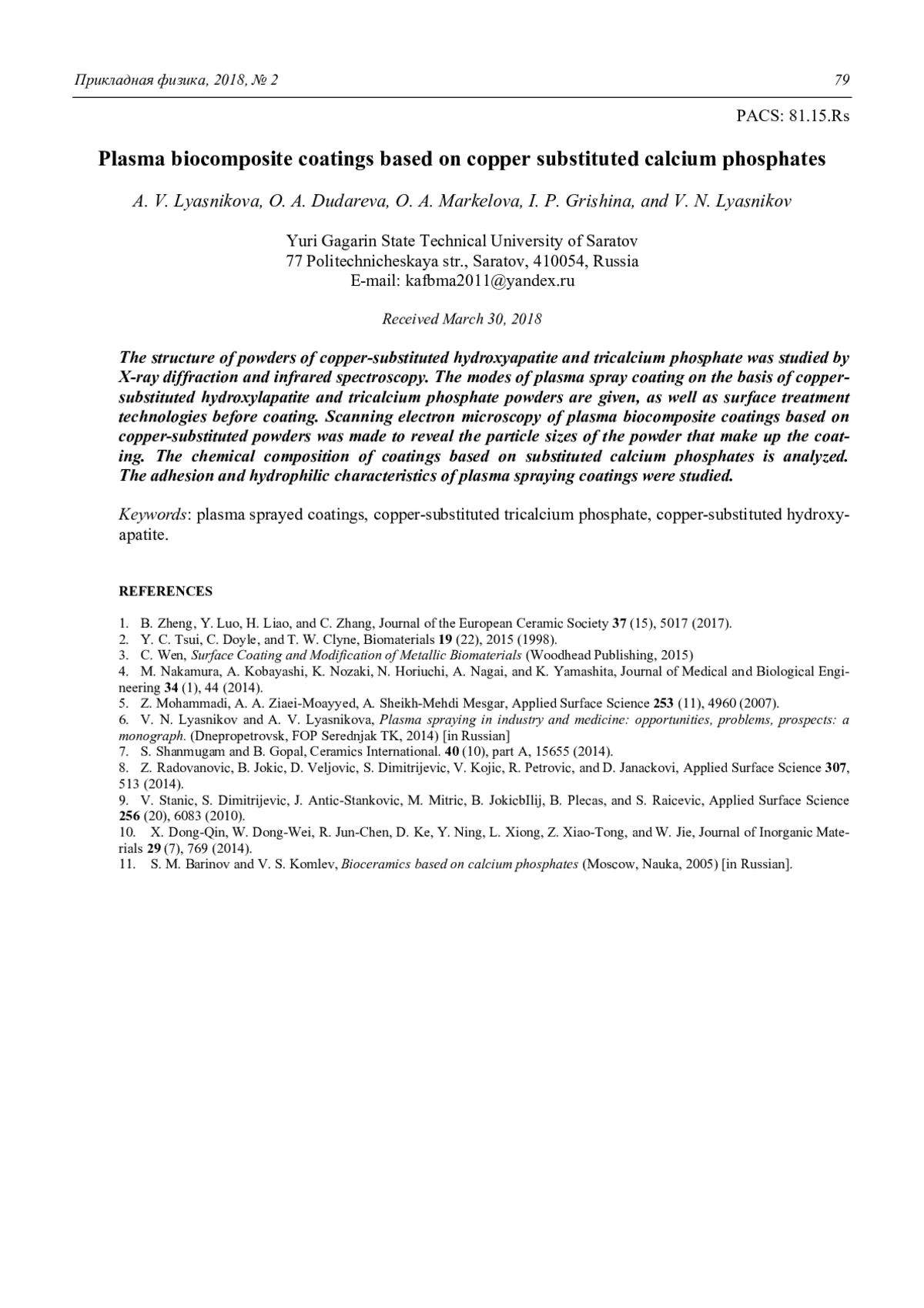 Статья: Плазменные биокомпозитные покрытия на основе медьзамещенных кальцийфосфатов (2018)