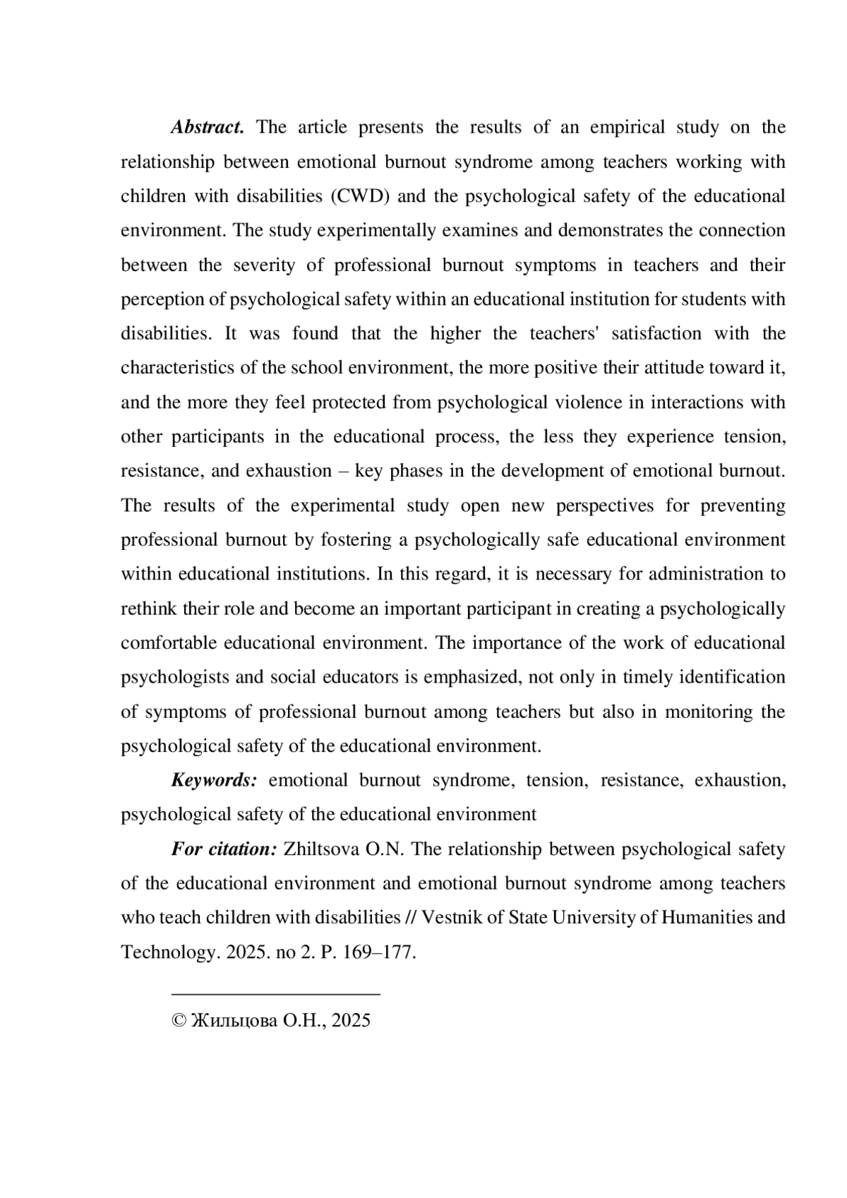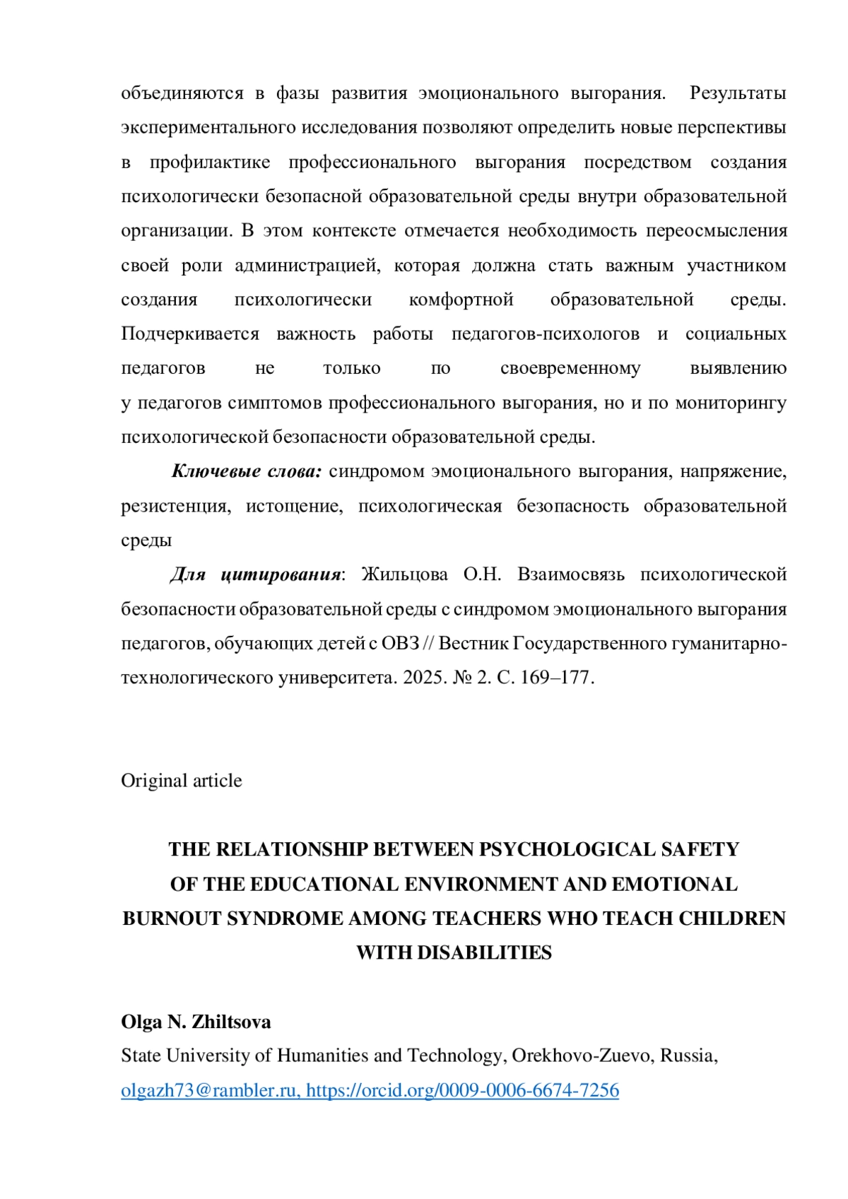 В статье представлены результаты эмпирического исследования связи синдрома эмоционального выгорания педагогов, обучающих детей с ОВЗ, с психологической безопасностью образовательной среды. Экспериментально изучена и показана связь между выраженностью симптомов профессионального выгорания у педагогов и тем, насколько педагоги ощущают себя психологически безопасно в образовательной организации для обучающихся с ОВЗ.