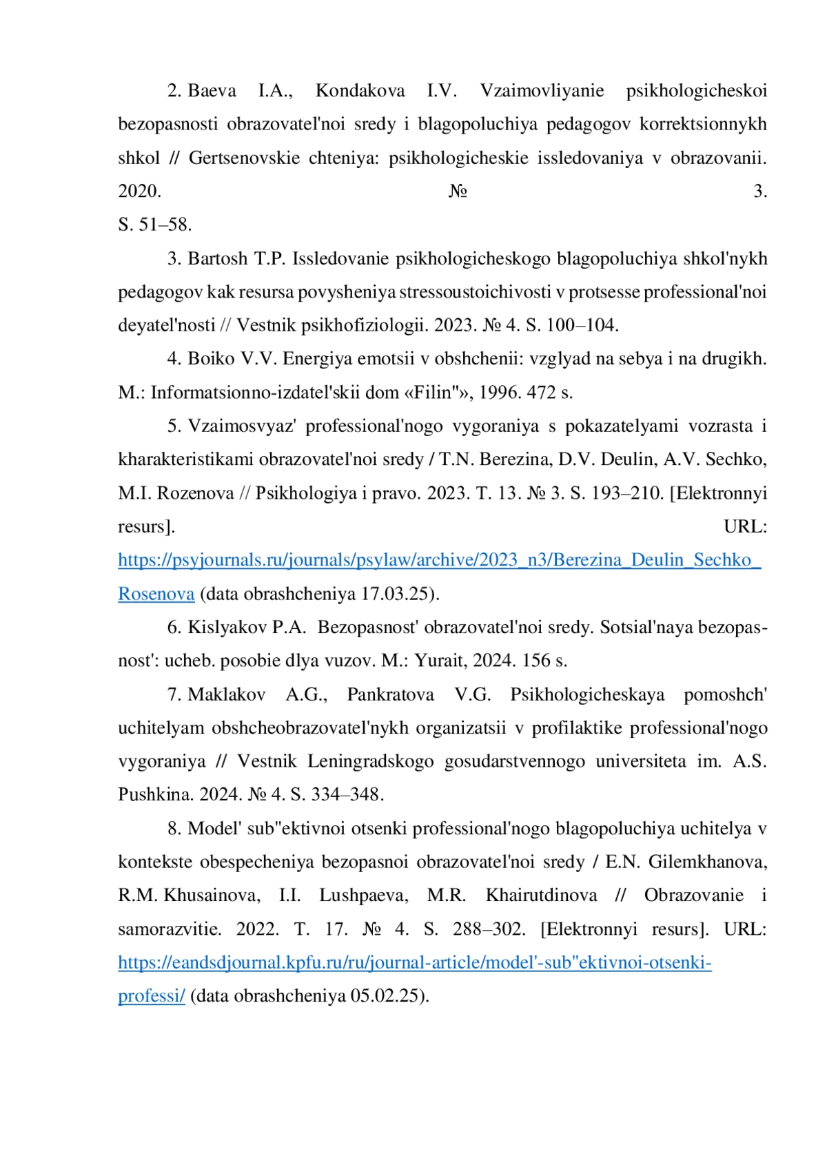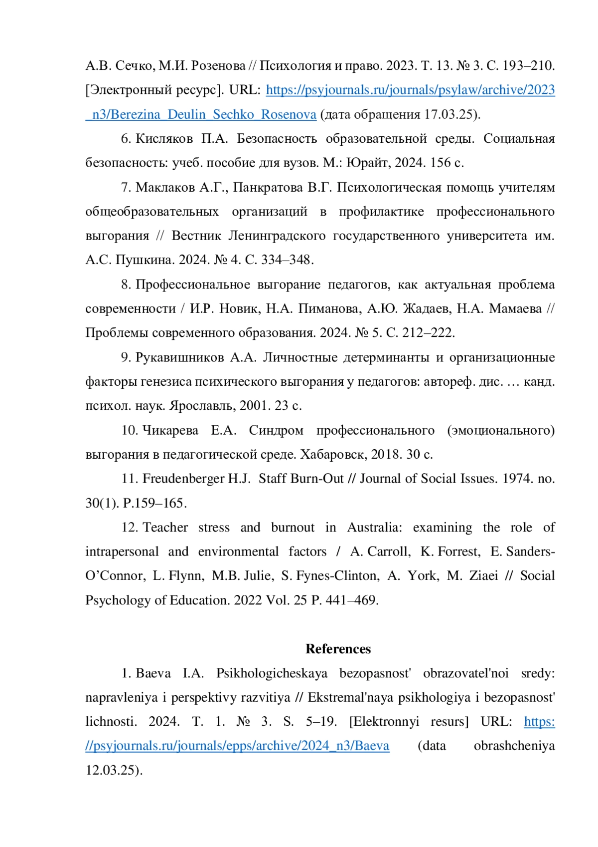 5. Взаимосвязь профессионального выгорания с показателями возраста и характеристиками образовательной среды / Т.Н. Березина, Д.В. Деулин, А.В. Сечко, М.И. Розенова / Психология и право. 2023. Т. 13. № 3. С. 193-210. [Электронный ресурс]. URL: https://psyjournals.ru/journals/psylaw/archive/2023_n3/Berezina_Deulin_Sechko_Rosenova(датаобращения17.03.25). EDN: CWLHII