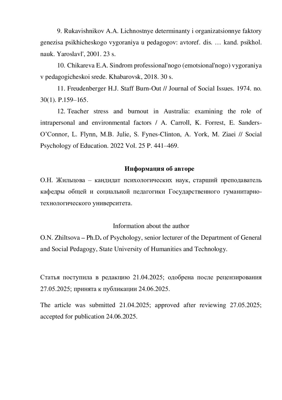 9. Рукавишников А.А. Личностные детерминанты и организационные факторы генезиса психического выгорания у педагогов: автореф. дис. … канд. психол. наук. Ярославль, 2001. 23 с. EDN: NLVRFH