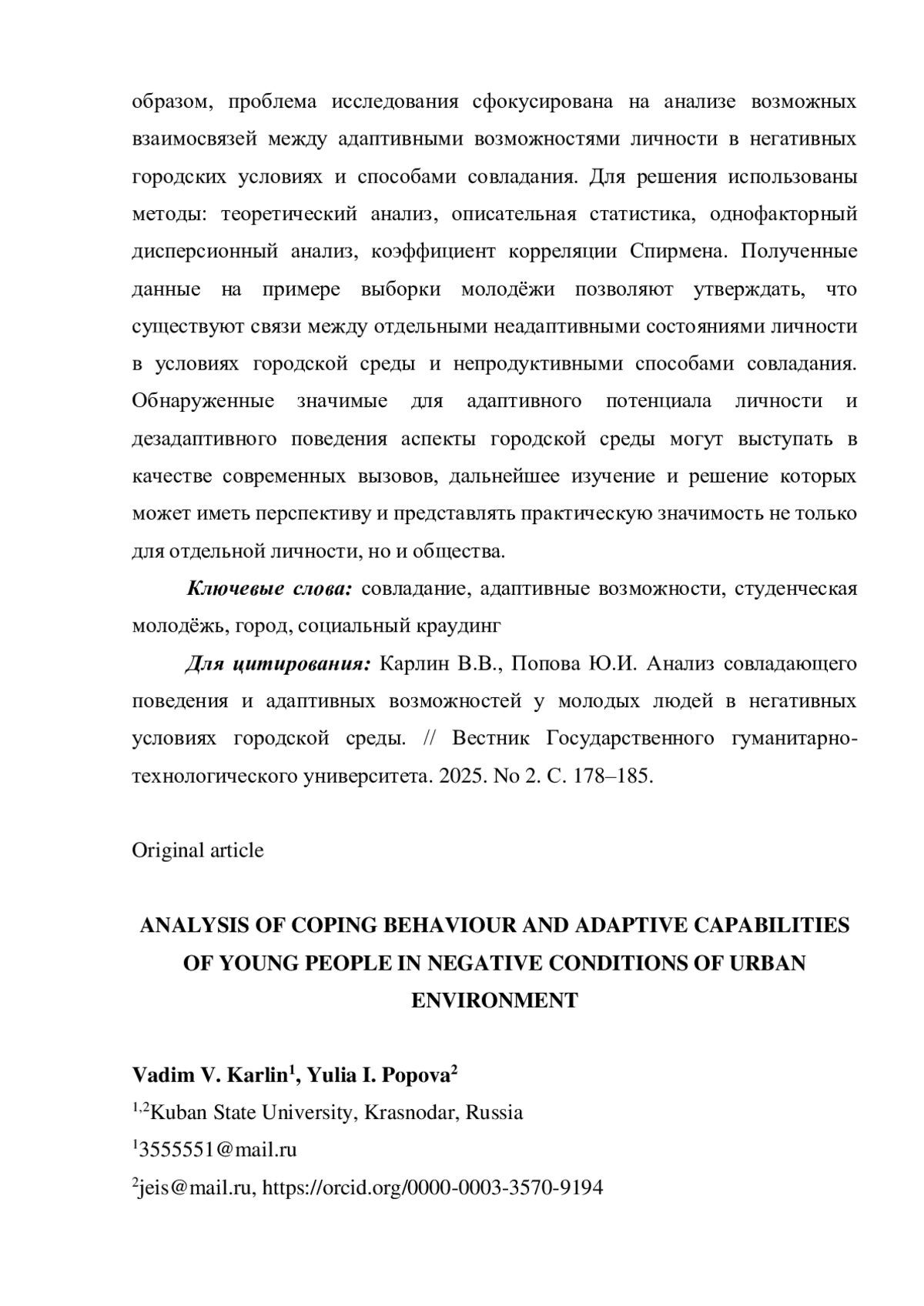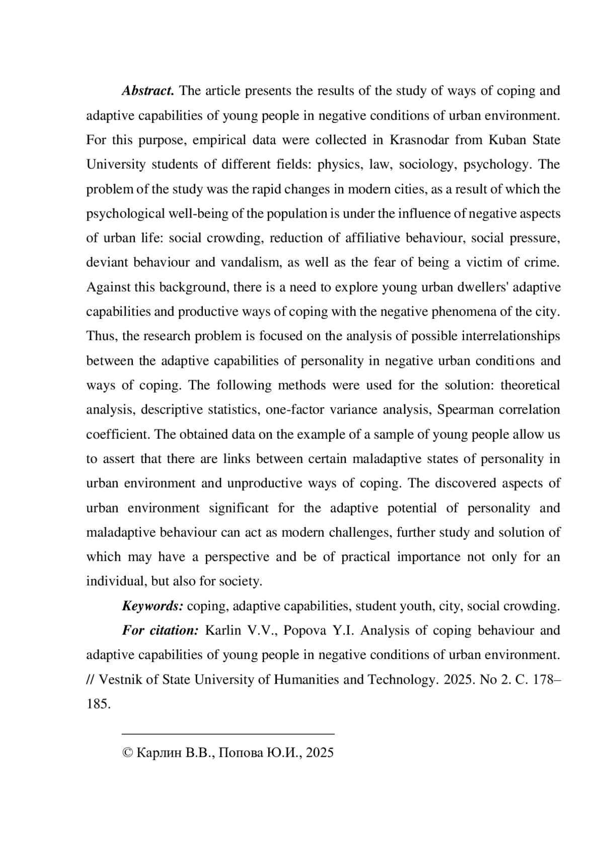 На фоне этого возникает необходимость изучения у молодых горожан адаптивных возможностей и продуктивных способов совладания с негативными явлениями города.