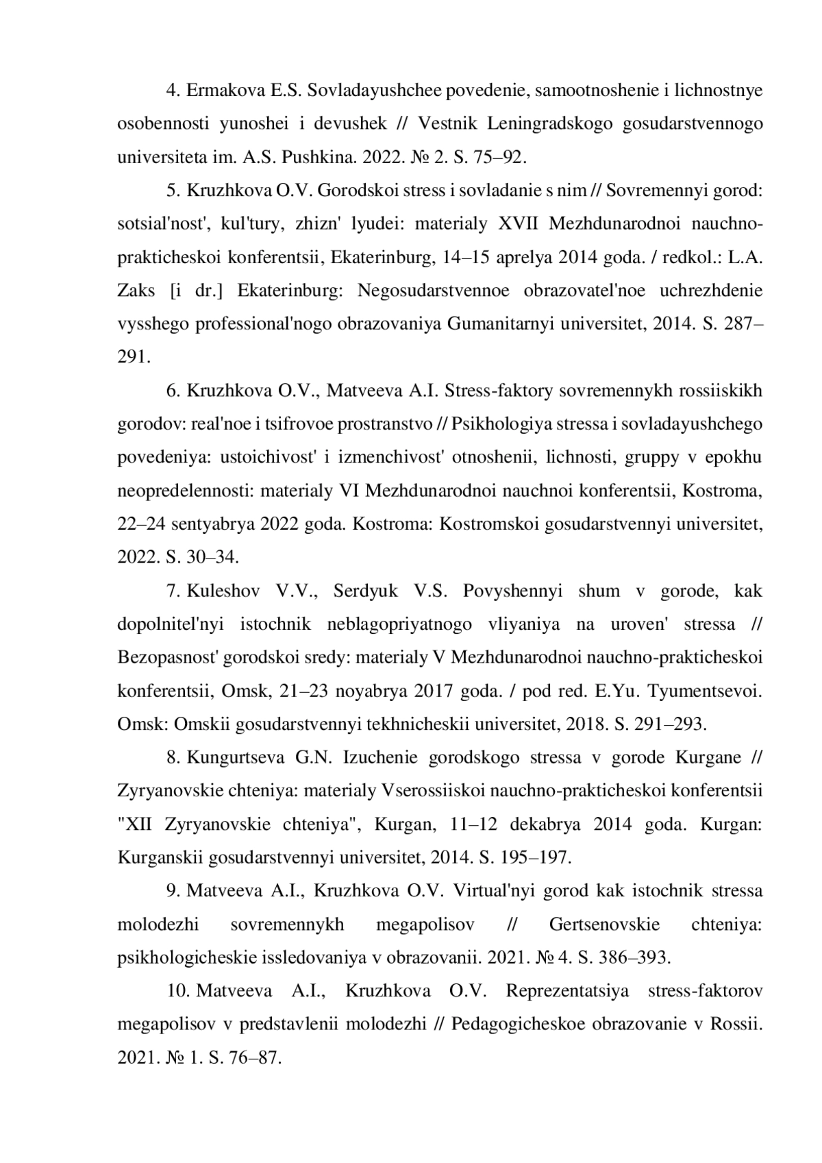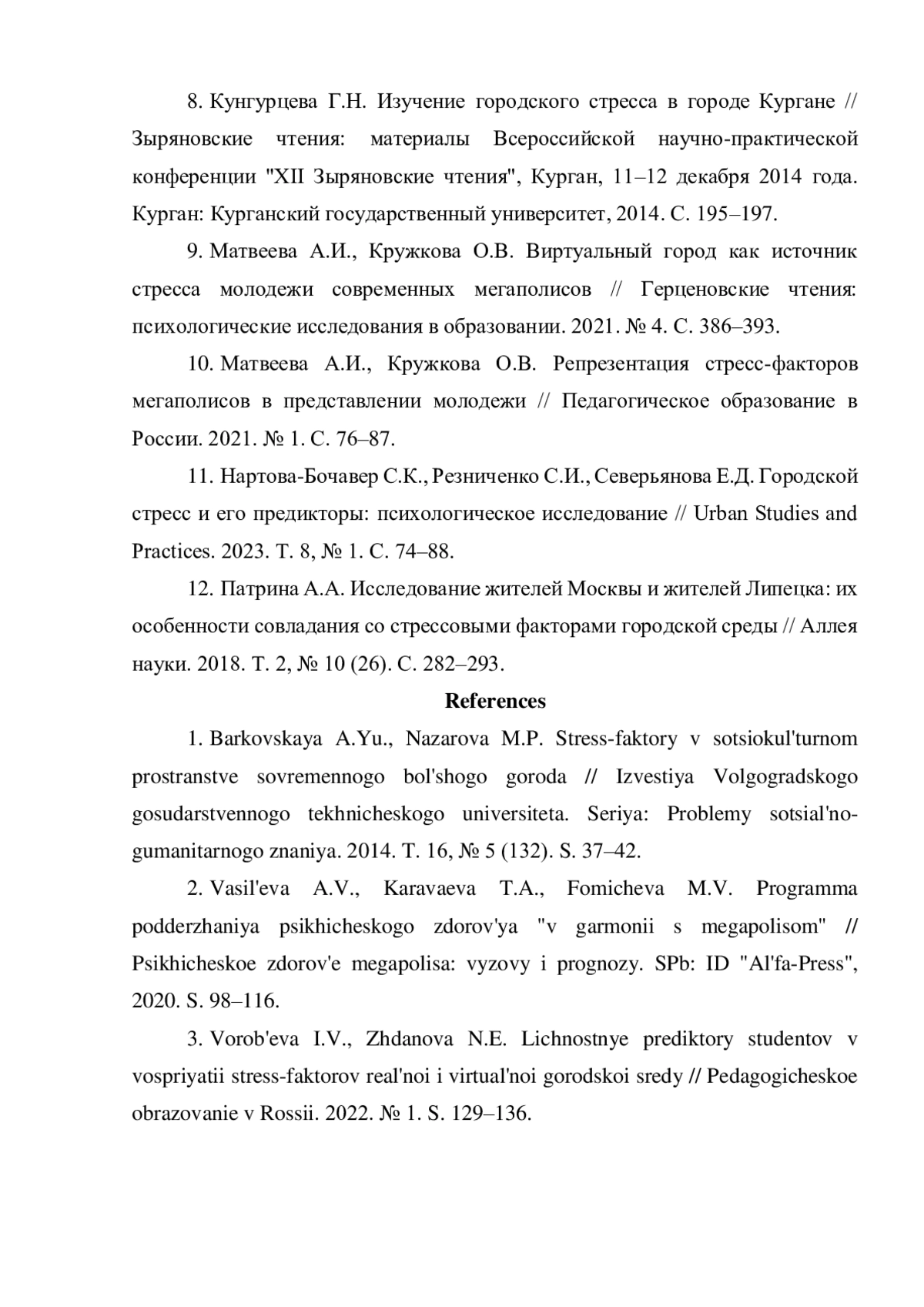 10. Матвеева А.И., Кружкова О.В. Репрезентация стресс-факторов мегаполисов в представлении молодежи // Педагогическое образование в России. 2021. № 1. С. 76-87.