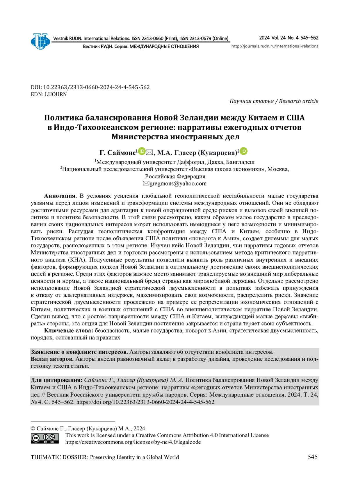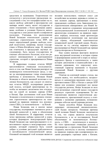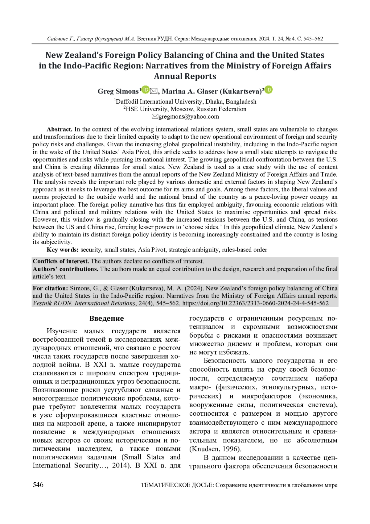 В условиях усиления глобальной геополитической нестабильности малые государства уязвимы перед лицом изменений и трансформации системы международных отношений. Они не обладают достаточными ресурсами для адаптации к новой операционной среде рисков и вызовов своей внешней политике и политике безопасности. В этой связи рассмотрено, каким образом малое государство в преследовании своих национальных интересов может использовать имеющиеся у него возможности и минимизировать риски. Растущая геополитическая конфронтация между США и Китаем, особенно в Индо-Тихоокеанском регионе после объявления США политики «поворота к Азии», создает дилеммы для малых государств, расположенных в этом регионе. Изучен кейс Новой Зеландии, чьи нарративы годовых отчетов Министерства иностранных дел и торговли рассмотрены с использованием метода критического нарративного анализа (КНА). Полученные результаты позволили выявить роль различных внутренних и внешних факторов, формирующих подход Новой Зеландии к оптимальному достижению своих внешнеполитических целей в регионе. Среди этих факторов важное место занимают транслируемые во внешний мир либеральные ценности и нормы, а также национальный бренд страны как миролюбивой державы. Отдельно рассмотрено использование Новой Зеландией стратегической двусмысленности в попытках избежать принуждения к отказу от альтернативных издержек, максимизировать свои возможности, распределить риски. Значение стратегической двусмысленности прослежено на примере ее репрезентации экономических отношений с Китаем, политических и военных отношений с США во внешнеполитическом нарративе Новой Зеландии. Сделан вывод, что с ростом напряженности между США и Китаем, вынуждающей малые державы «выбирать» стороны, эта опция для Новой Зеландии постепенно закрывается и страна теряет свою субъектность.