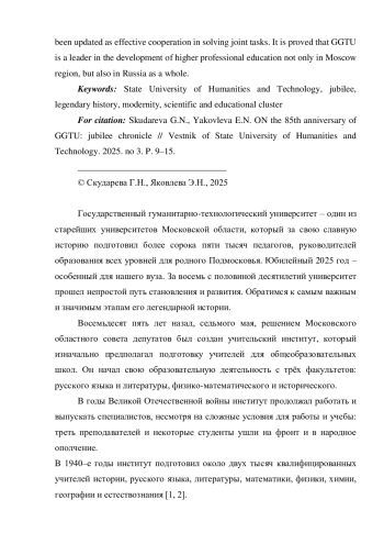 В статье представлены фактологические материалы, характеризующие исторический путь создания, становления и развития университета. Поименованы руководители, внесшие свой личностный и профессиональный вклад в историю вуза с кратким обзором их деятельности. Отражены факты, подтверждающие позиционирование вуза как крупного научно-образовательного кластера восточного Подмосковья и центра непрерывного педагогического образования. Уделено внимание успешной подготовке кадров в системе среднего профессионального образования, органично интегрированной в образовательное пространство ГГТУ. Описана инновационная образовательная инфраструктура университета. Названы студенты и выпускники, являющиеся гордостью вуза и достигшие высоких результатов в своей профессиональной деятельности. Актуализировано стратегическое партнерство университета, как эффективное взаимодействие в решении совместных задач. Доказано, что ГГТУ - лидер в развитии высшего профессионального образования не только Московской области, но и России в целом.