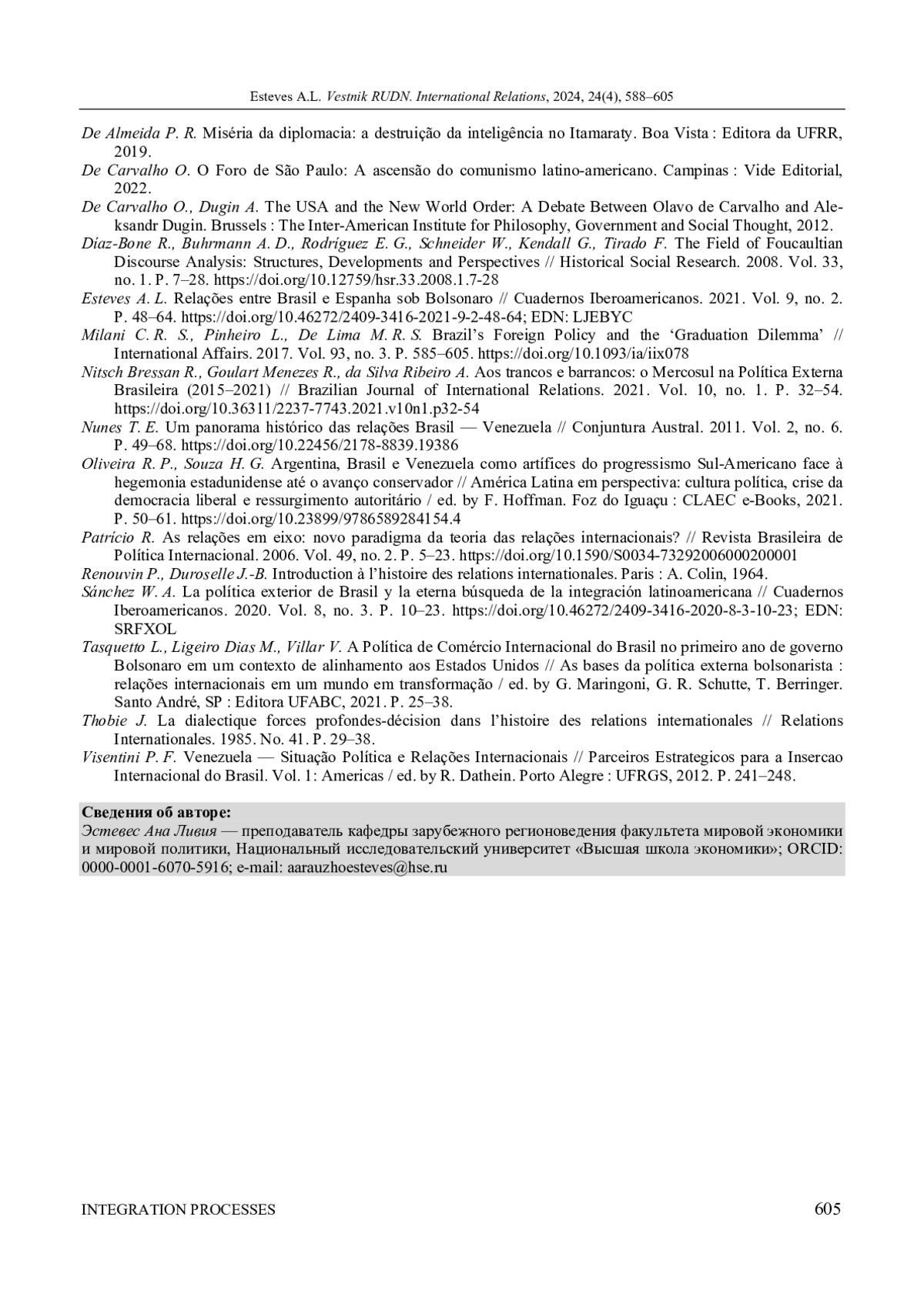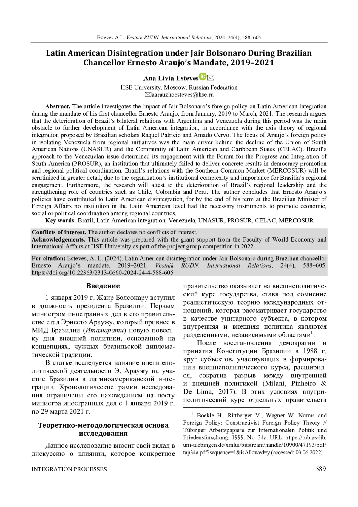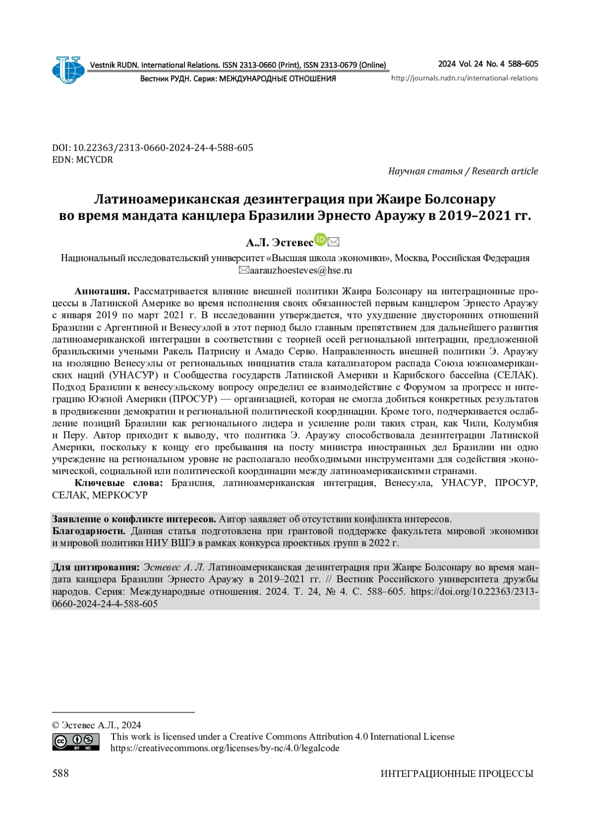 ЭСТЕВЕС А. Л. ЛАТИНОАМЕРИКАНСКАЯ ДЕЗИНТЕГРАЦИЯ ПРИ ЖАИРЕ БОЛСОНАРУ ВО ВРЕМЯ МАНДАТА КАНЦЛЕРА БРАЗИЛИИ ЭРНЕСТО АРАУЖУ В 2019-2021 ГГ. // ВЕСТНИК РОССИЙСКОГО УНИВЕРСИТЕТА ДРУЖБЫ НАРОДОВ. СЕРИЯ: МЕЖДУНАРОДНЫЕ ОТНОШЕНИЯ. 2024. ТОМ 24 № 4
