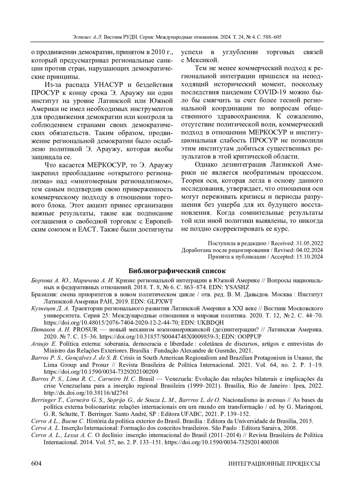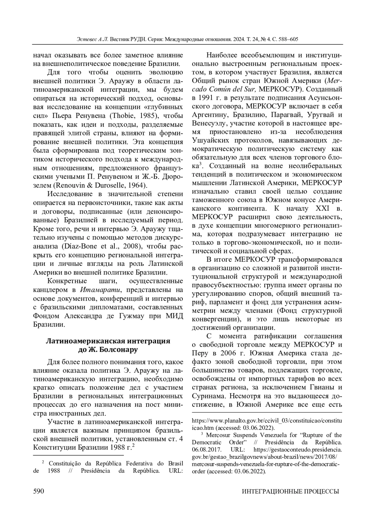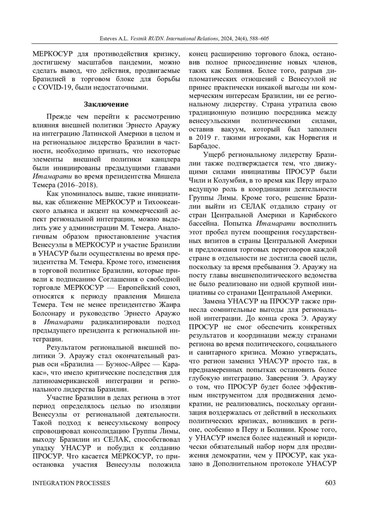 ЭСТЕВЕС А. Л. ЛАТИНОАМЕРИКАНСКАЯ ДЕЗИНТЕГРАЦИЯ ПРИ ЖАИРЕ БОЛСОНАРУ ВО ВРЕМЯ МАНДАТА КАНЦЛЕРА БРАЗИЛИИ ЭРНЕСТО АРАУЖУ В 2019-2021 ГГ. // ВЕСТНИК РОССИЙСКОГО УНИВЕРСИТЕТА ДРУЖБЫ НАРОДОВ. СЕРИЯ: МЕЖДУНАРОДНЫЕ ОТНОШЕНИЯ. 2024. ТОМ 24 № 4