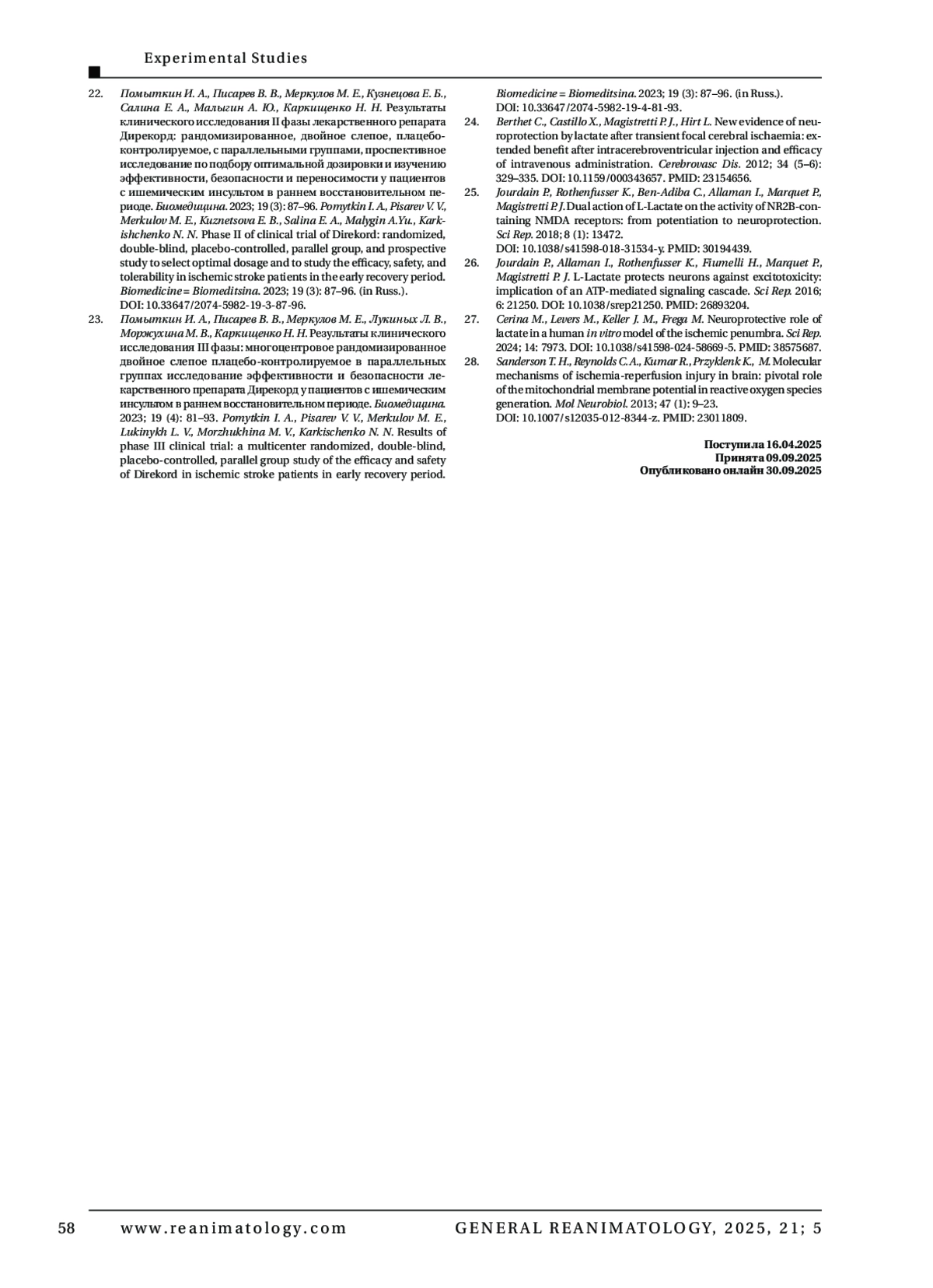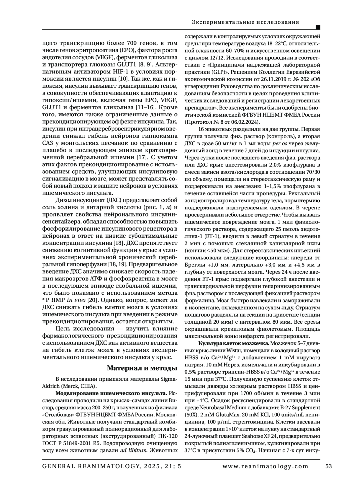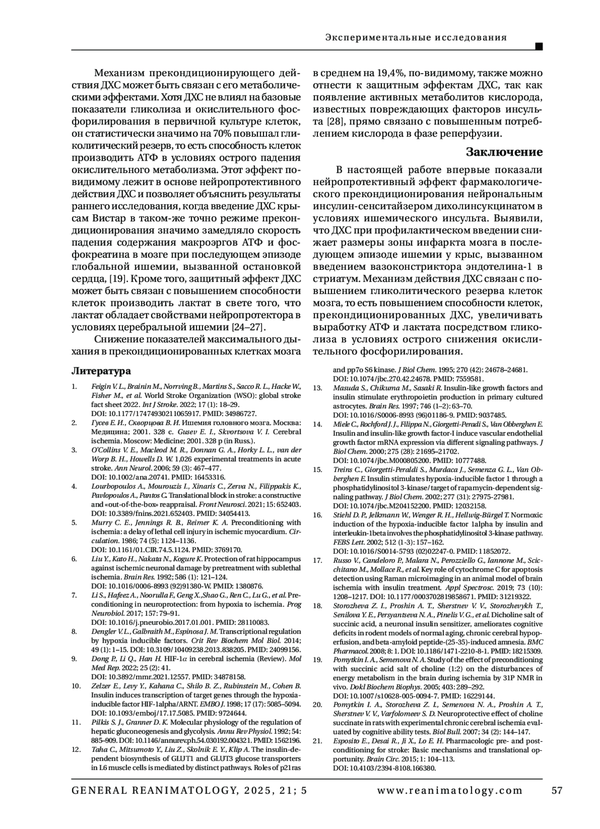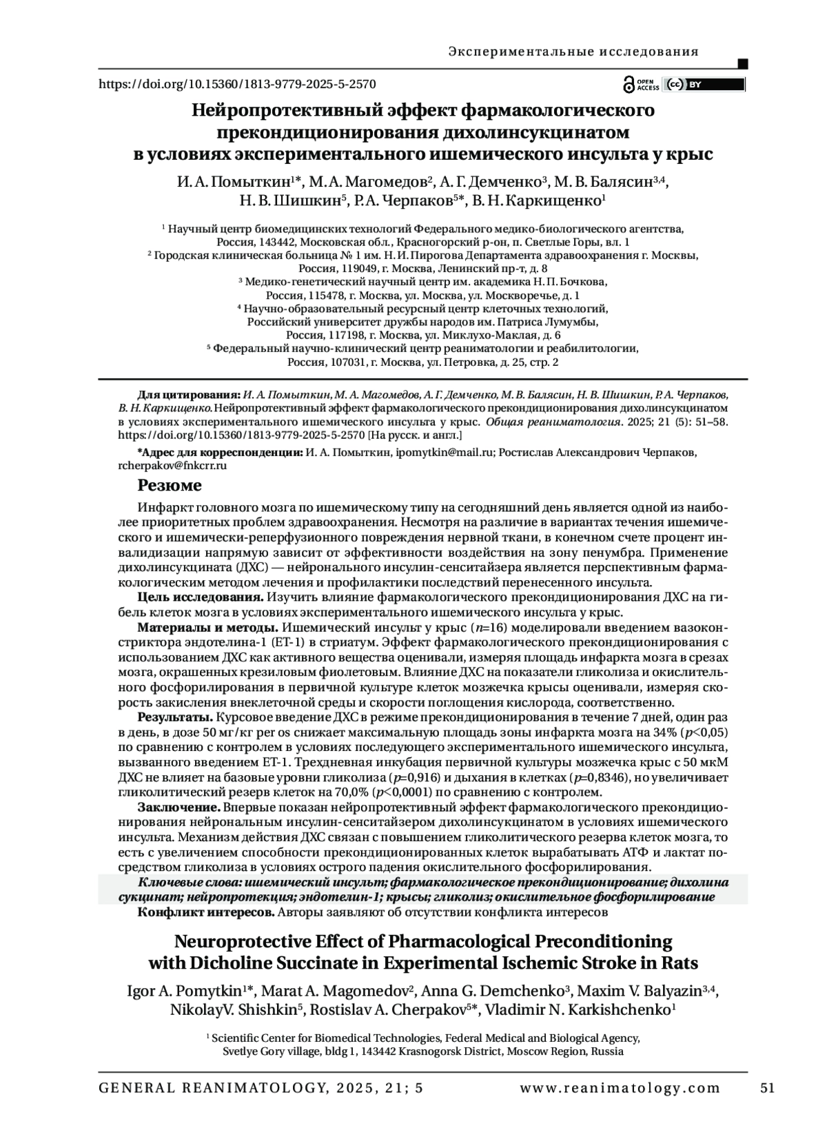 ПОМЫТКИН И. А., МАГОМЕДОВ М. А., ДЕМЧЕНКО А. Г., БАЛЯСИН М. В., ШИШКИН Н.В., ЧЕРПАКОВ Р. А., КАРКИЩЕНКО В.Н. НЕЙРОПРОТЕКТИВНЫЙ ЭФФЕКТ ФАРМАКОЛОГИЧЕСКОГО ПРЕКОНДИЦИОНИРОВАНИЯ ДИХОЛИНСУКЦИНАТОМ В УСЛОВИЯХ ЭКСПЕРИМЕНТАЛЬНОГО ИШЕМИЧЕСКОГО ИНСУЛЬТА У КРЫС // ОБЩАЯ РЕАНИМАТОЛОГИЯ. 2025. № 5, ТОМ 21