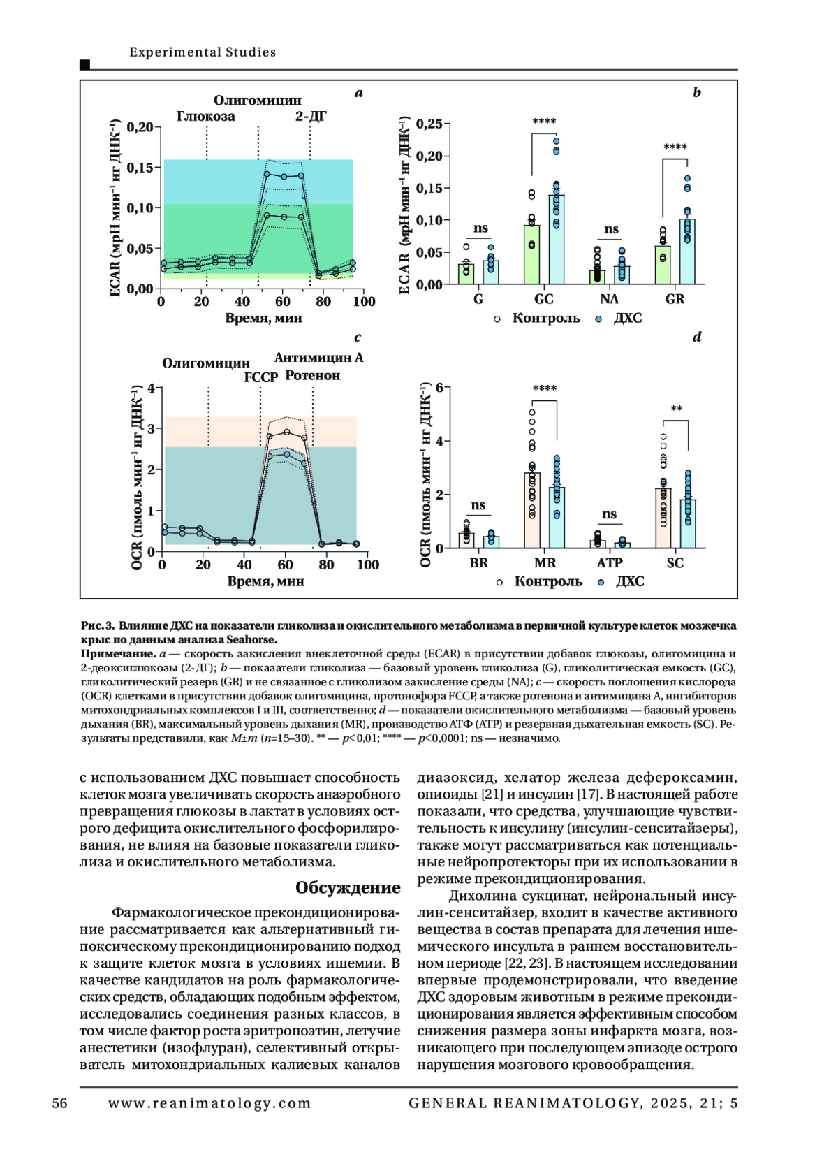 Результаты. Курсовое введение ДХС в режиме прекондиционирования в течение 7 дней, один раз в день, в дозе 50 мг/кг per os снижает максимальную площадь зоны инфаркта мозга на 34% (p0,05) по сравнению с контролем в условиях последующего экспериментального ишемического инсульта, вызванного введением ET-1. Трехдневная инкубация первичной культуры мозжечка крыс с 50 мкМ ДХС не влияет на базовые уровни гликолиза (p=0,916) и дыхания в клетках (p=0,8346), но увеличивает гликолитический резерв клеток на 70,0% (p0,0001) по сравнению с контролем.