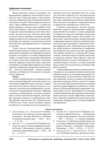 5. Коноплева Ю. А., Корыстов В. А., Тесленко Д. В. Кибербезопасность как фактор развития цифровой экономики // Вестник СевероКавказского федерального университета. - 2019. - № 4(73). - С. 49-55.